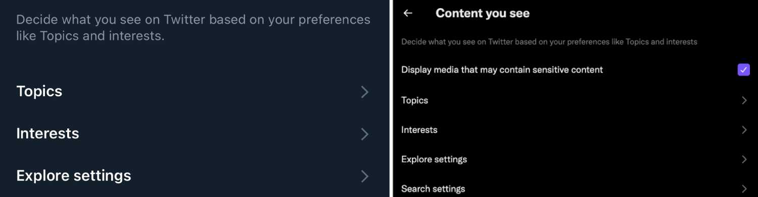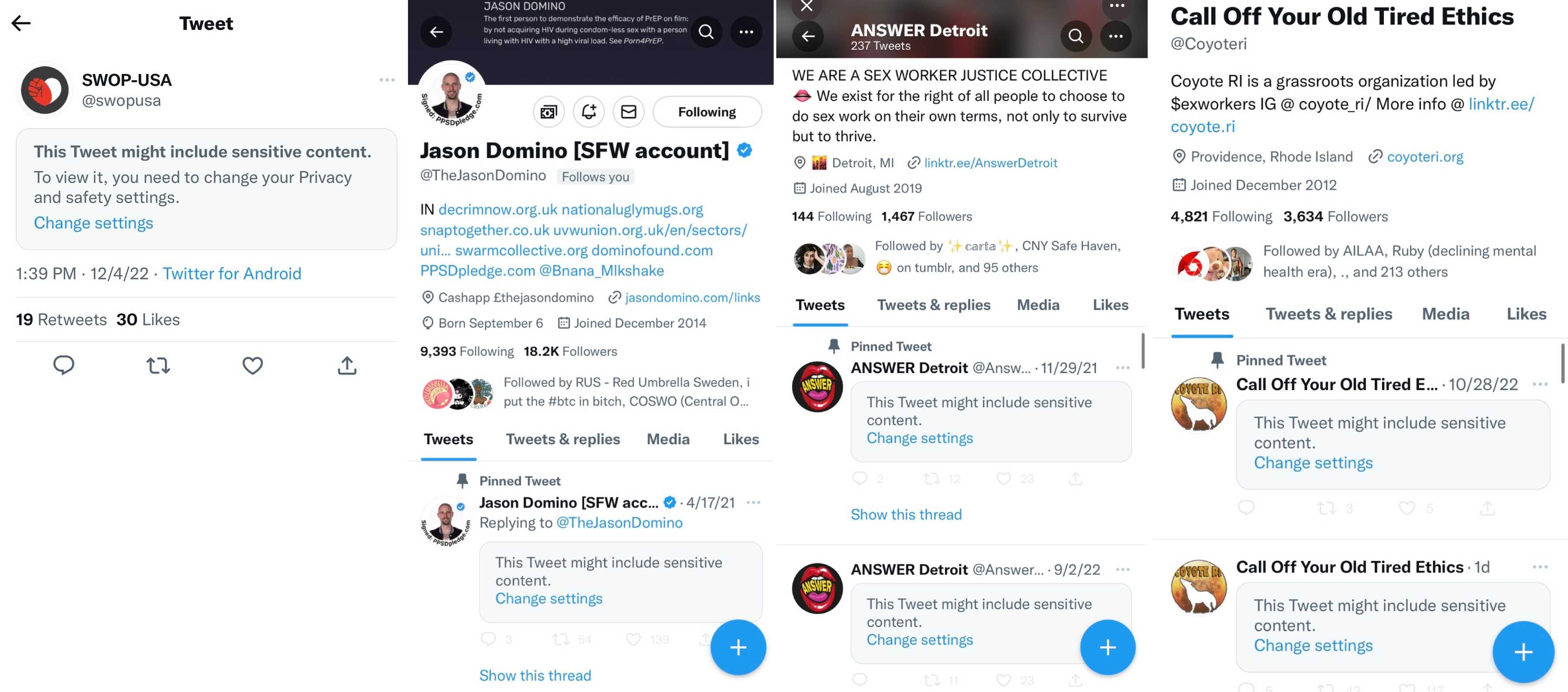 Some sex workers have noticed that suddenly, their tweets are being flagged as containing sensitive content, and are unable to be viewed. On the web version of Twitter, you can click and unclick a box that says “Display media that may contain sensitive content.” On iOS, users do not have the option to toggle that setting on or off. Even SFW accounts of advocacy groups representing sex workers have been flagged as sensitive for some iOS users, even for those whose web settings indicate that they are willing to see sensitive media.