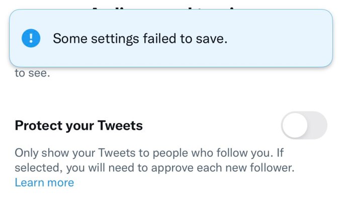 As Elon Musk attempts to operate a major social media platform with a fraction of its staff, Twitter users are reporting that certain key security features on iOS are not working. For some users, it’s impossible to protect your tweets or toggle direct message privacy settings — a pop-up will appear that says “Some settings failed to save.” [Update, 12/7/22, 1:45 PM ET: A day after publication, Twitter Support tweeted that they fixed this error.]