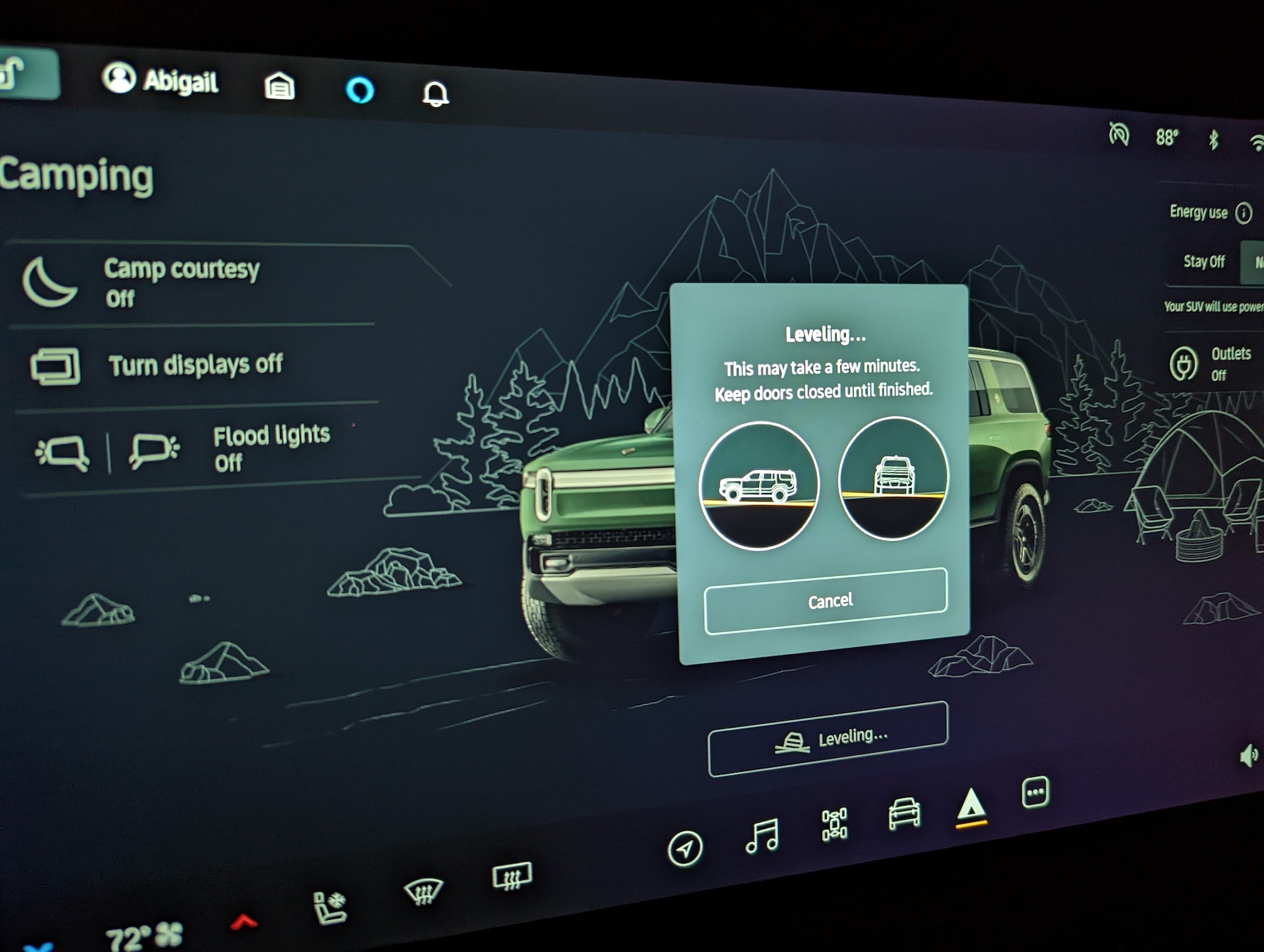 Once I figured out where to set up, I drove over, parked and toggled through a few menus to find Camp Mode, a feature Rivian released via an over-the-air-update over Labor Day weekend this year. Camp Mode offers a suite of features and settings that includes vehicle leveling of up to 7.28 inches in each corner, optimized energy use for overnight in-cabin charging and camping, and courtesy lighting and dimming settings for interior and exterior lights as well as the giant 16-inch infotainment screen at the center of the vehicle.
