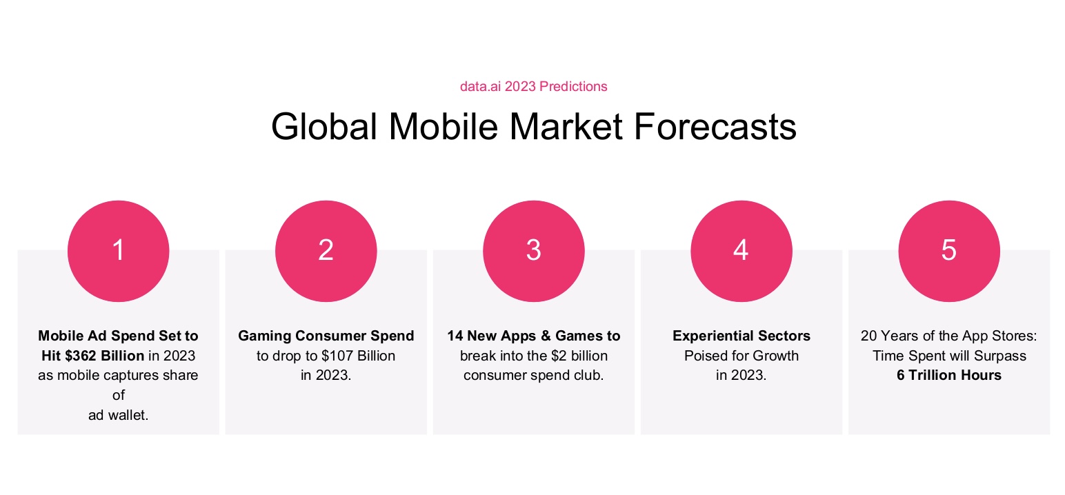 Data.ai released its annual report predicting the next big mobile trends for 2023 (below). The full report is here. Of particular interest is its bet that mobile ad spend will reach $362 billion next year.