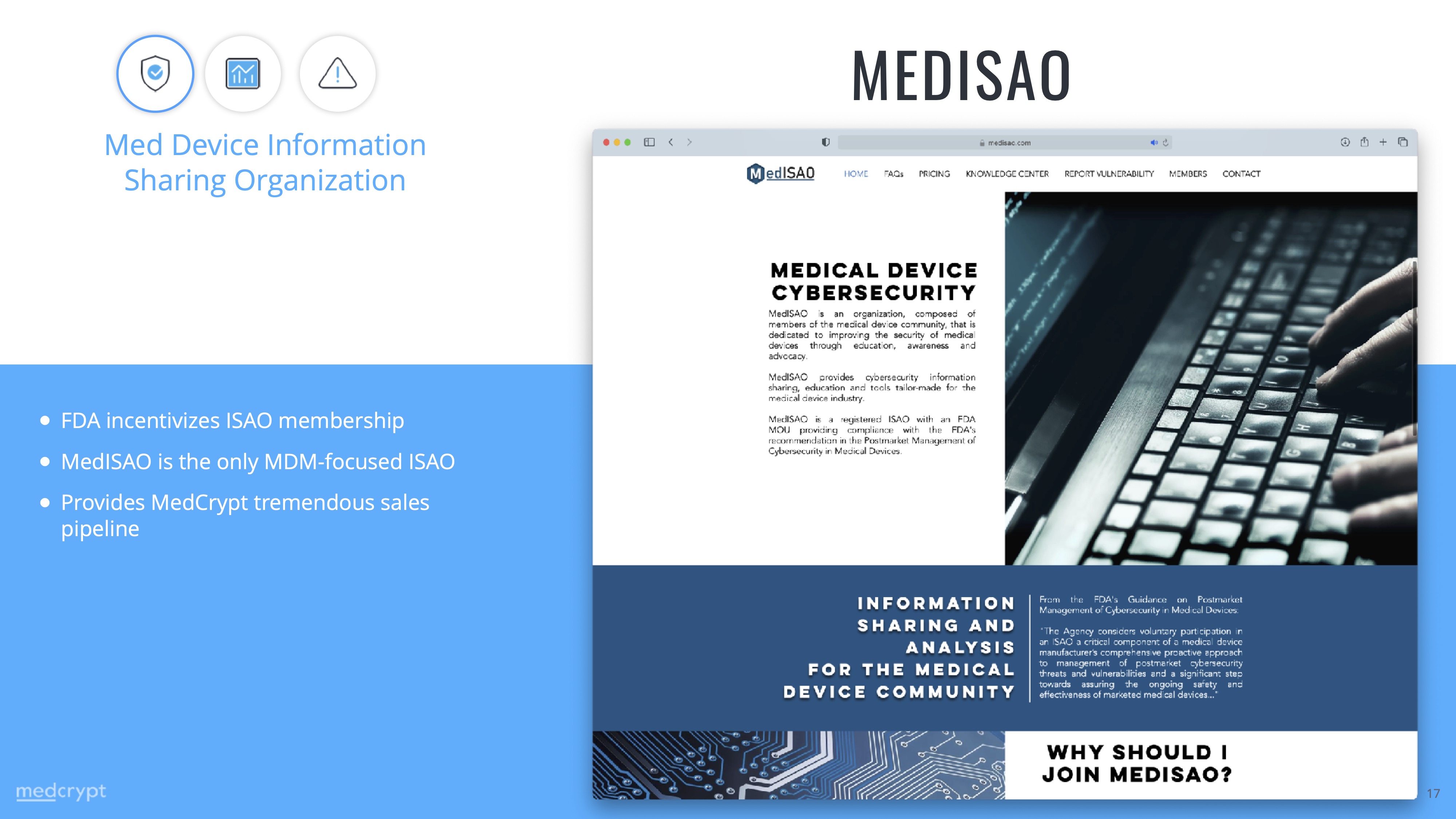 When I visited the MedISAO website, it finally clicked. The site’s FAQ states that “MedISAO is organized by MedCrypt, Inc., a healthcare-first cybersecurity company.”