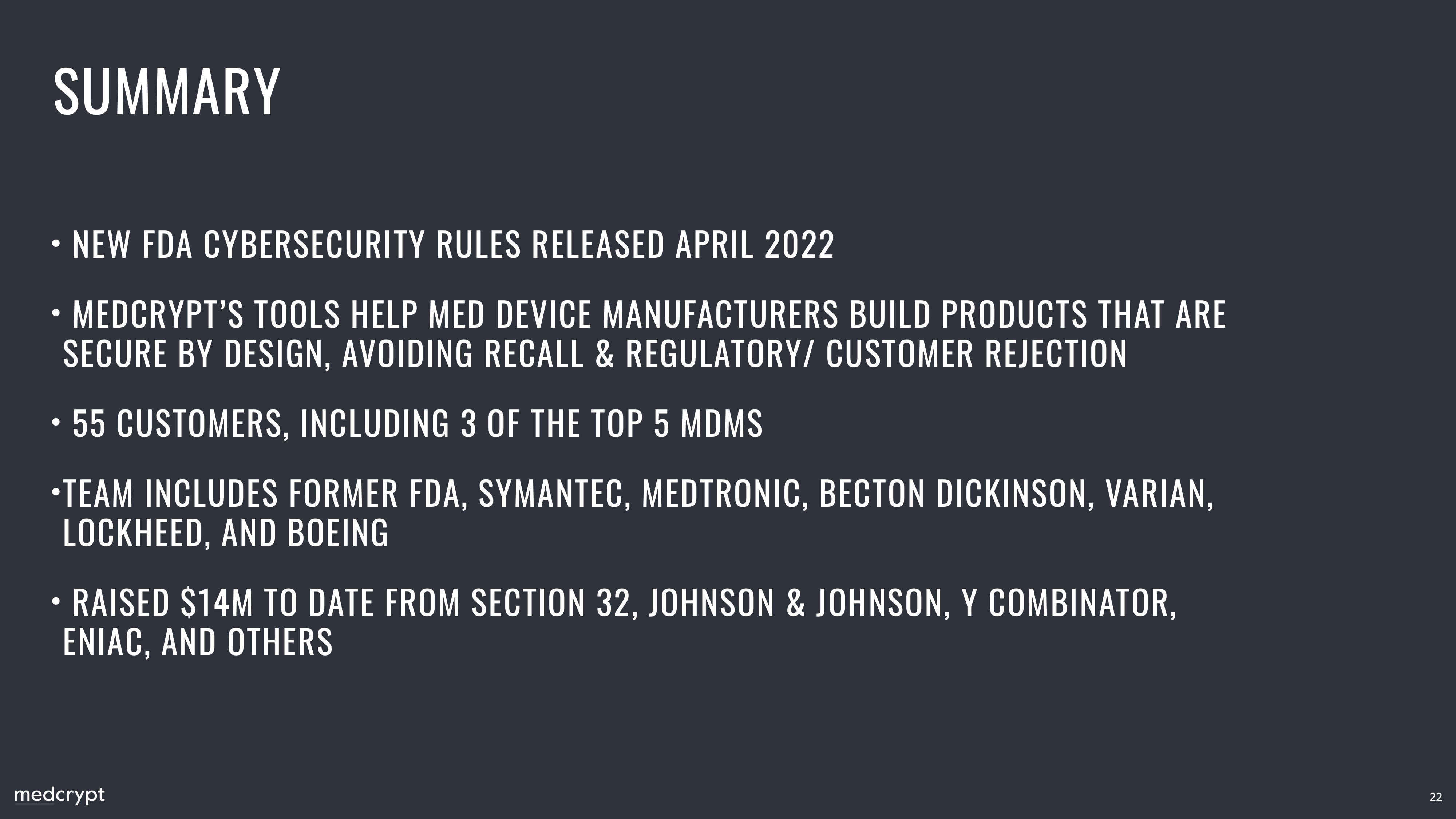 This slide is at once very good and pretty lacking. When it first came up, I was confused about what MedISAO was and why it was on the company’s slide deck. It shows that this deck was designed with a voice-over in mind rather than being readable on its own. This slide comes after three slides that explain MedCrypt’s products and uses the same design. Perhaps that should have been the tip-off that this is also one of the company’s products, but I found it confusing at first. Why is it good that the FDA recommends ISAO memberships? What the hell even is an ISAO? (I had to Google it; it’s an information sharing and analysis organization). Why is it important that MedISAO is good for MDM? (I know, I know. I had to Google that, too: medical device manufacturer). Yay, sales pipeline, I suppose?