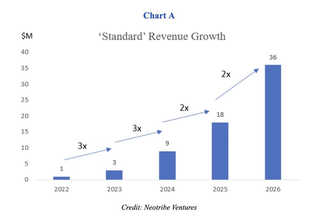 As shown in Chart F, assuming the company follows the same trend as companies in the 2018-2022 time frame, its revenue at the Series C stage will be $30 million. Using the median valuation multiple of 10x from that period, we can assume a valuation of $300 million, and consequently, value to the investor of: 2.7% x $300 million = $8.1 million.