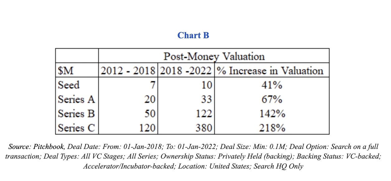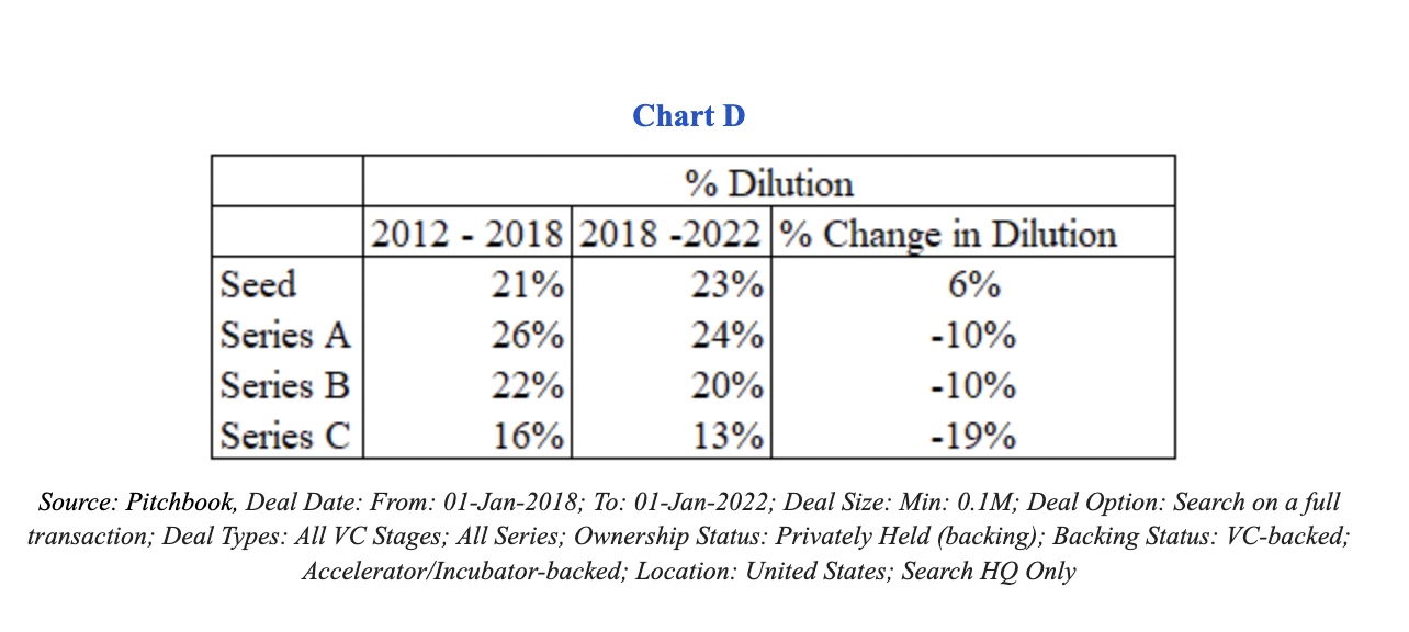 Let’s look at the historical data below (Chart E) to get some footing. If a company were to raise the same amount at each stage as the median during the 2018 to 2022 period, but do it in the valuation environment from 2012 to 2018, the founders would see significantly higher dilution.