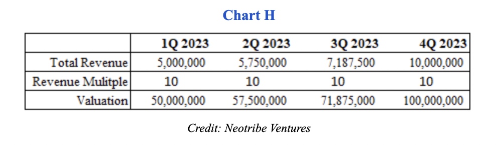 As shown above in Chart G, based on this plan, our company is likely raising off revenue of about $6.25 million, which is the 2Q 2023 number. Continuing to use our 10x revenue multiple, this implies a valuation of $62.5 million.