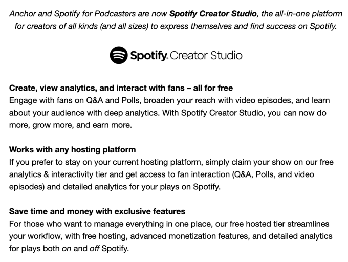 “Anchor and Spotify for Podcasters are now Spotify Creator Studio, the all-in-one platform for creators of all kinds (and sizes) to express themselves and find success on Spotify,” the sample announcement in the survey reads.