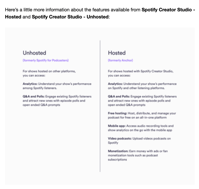 If the proposed rebrand from the survey were to go through, Spotify for Podcasters would be rebranded to “Spotify Creator Studio – Unhosted.” Anchor would be rebranded to “Spotify Creator Studio – Hosted.” Both products would remain free.