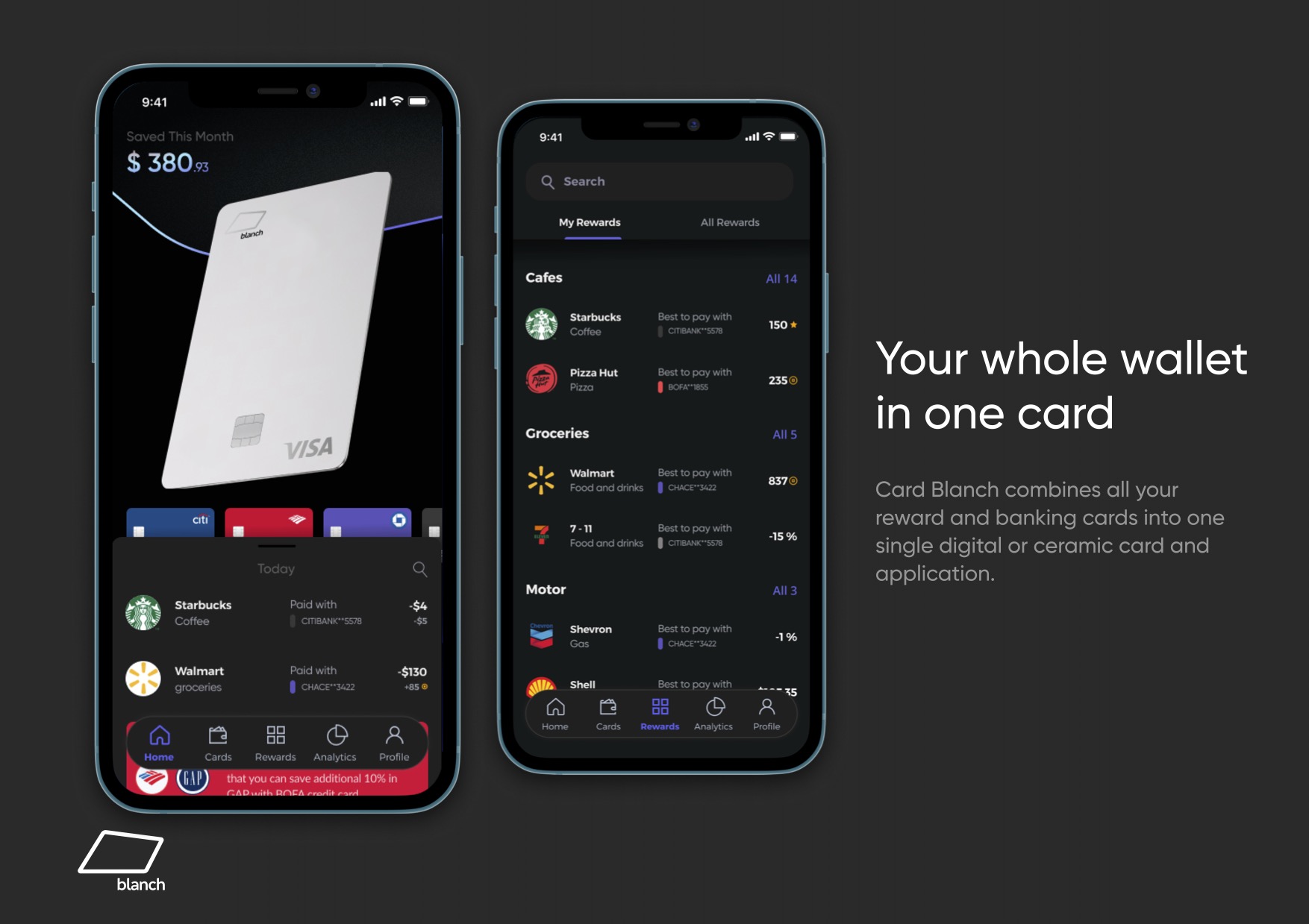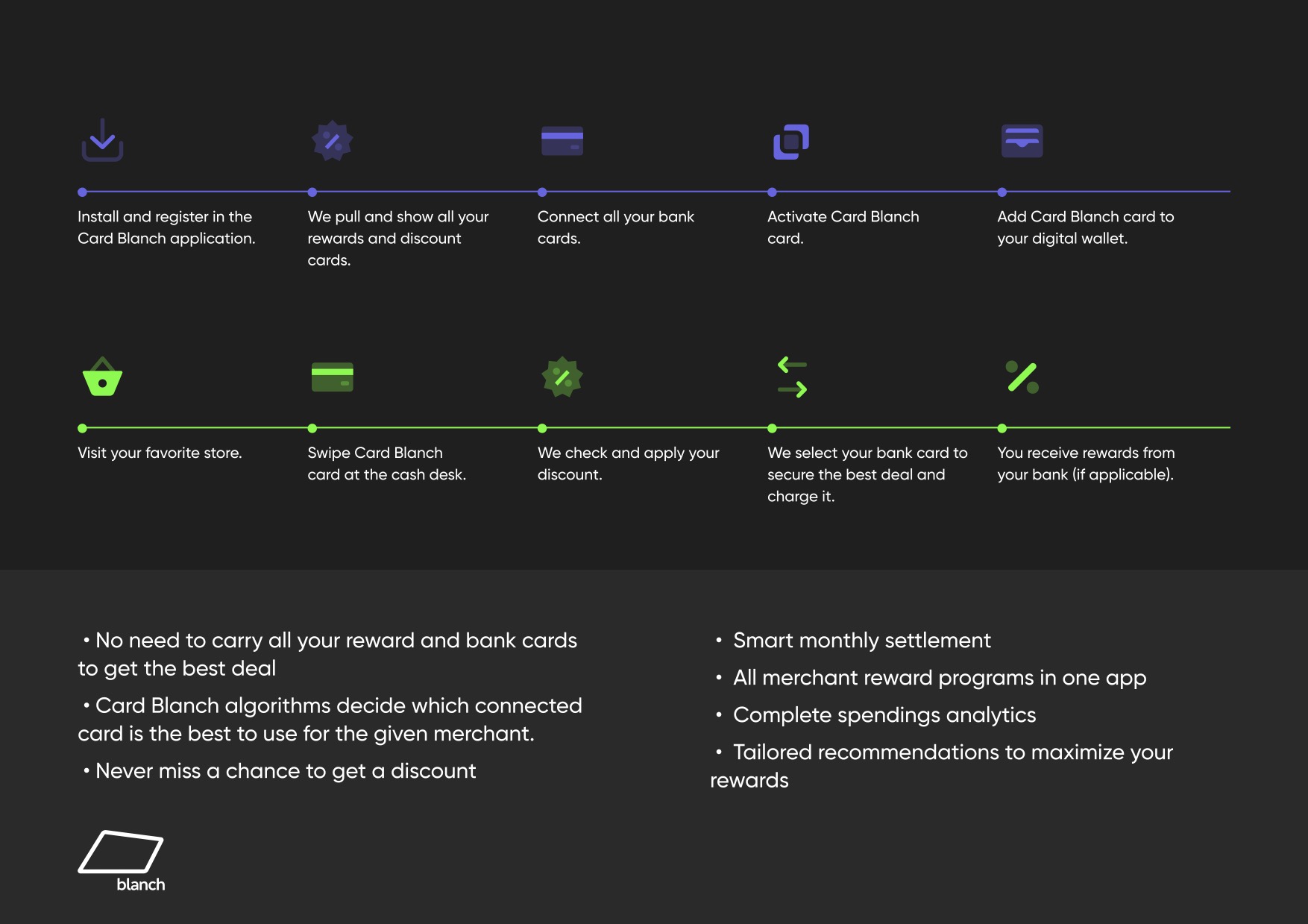 What Card Blanch really masters is telling its story through design mockups. The full story of how the product works — paying with the right card in the right place to maximize card benefits — fits into four elegant screenshots. (Slide 12 includes the rest.)