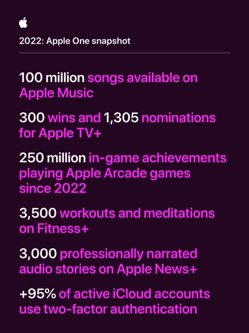 Apple also highlighted stats across other services, noting Apple Music has topped over 100 million songs, and growing Spatial Audio adoption with monthly listeners tripling since launch. Shazam’s 20th anniversary in 2022 saw it hitting the milestone of 70 billion all-time Shazams. (It didn’t report on its Podcasts figures, however.)