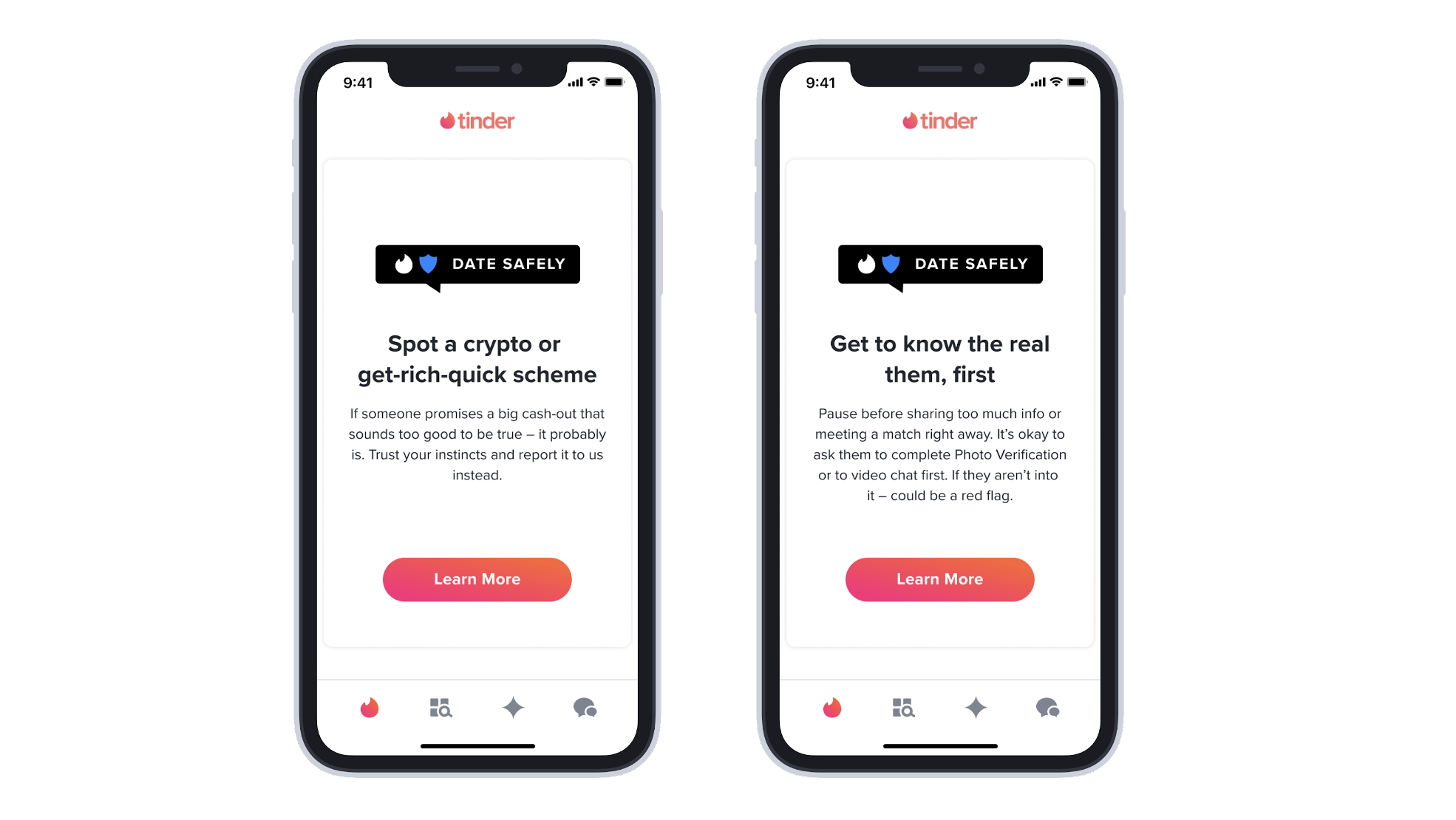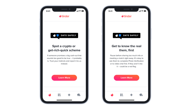 Tinder and French online dating app Meetic will prompt users with in-app messages with tips and common behaviors to watch out for. Suggestions include making sure potential matches have their profile picture verified, video chatting with them before meeting in person and learning how to recognize scammer red flags.