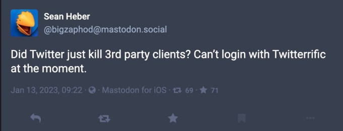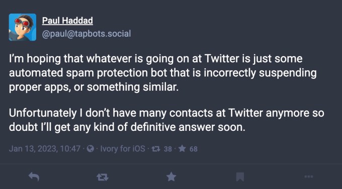 Makers of these apps also complained about these issues on Mastadon. Twitterrific developer Sean Heber said, “Did Twitter just kill 3rd party clients?” while Tweetbot’s Paul Haddad said, “I’m hoping whatever is going on at Twitter is just some automated spam protection bot that is incorrectly suspending proper apps.”
