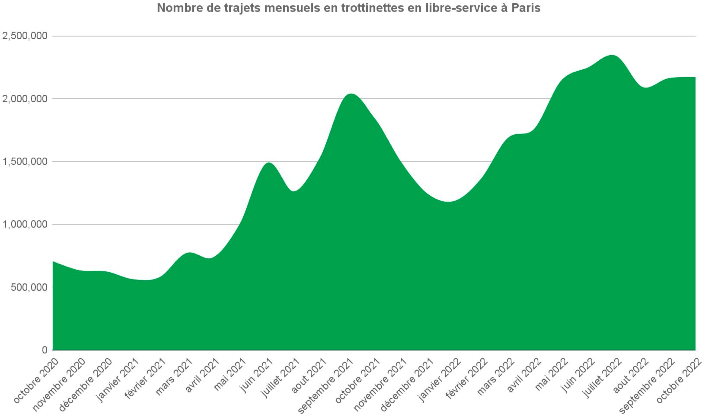 But each scooter is used quite extensively in Paris — several times per day. Here’s a chart of the total number of scooter rides per month in Paris: