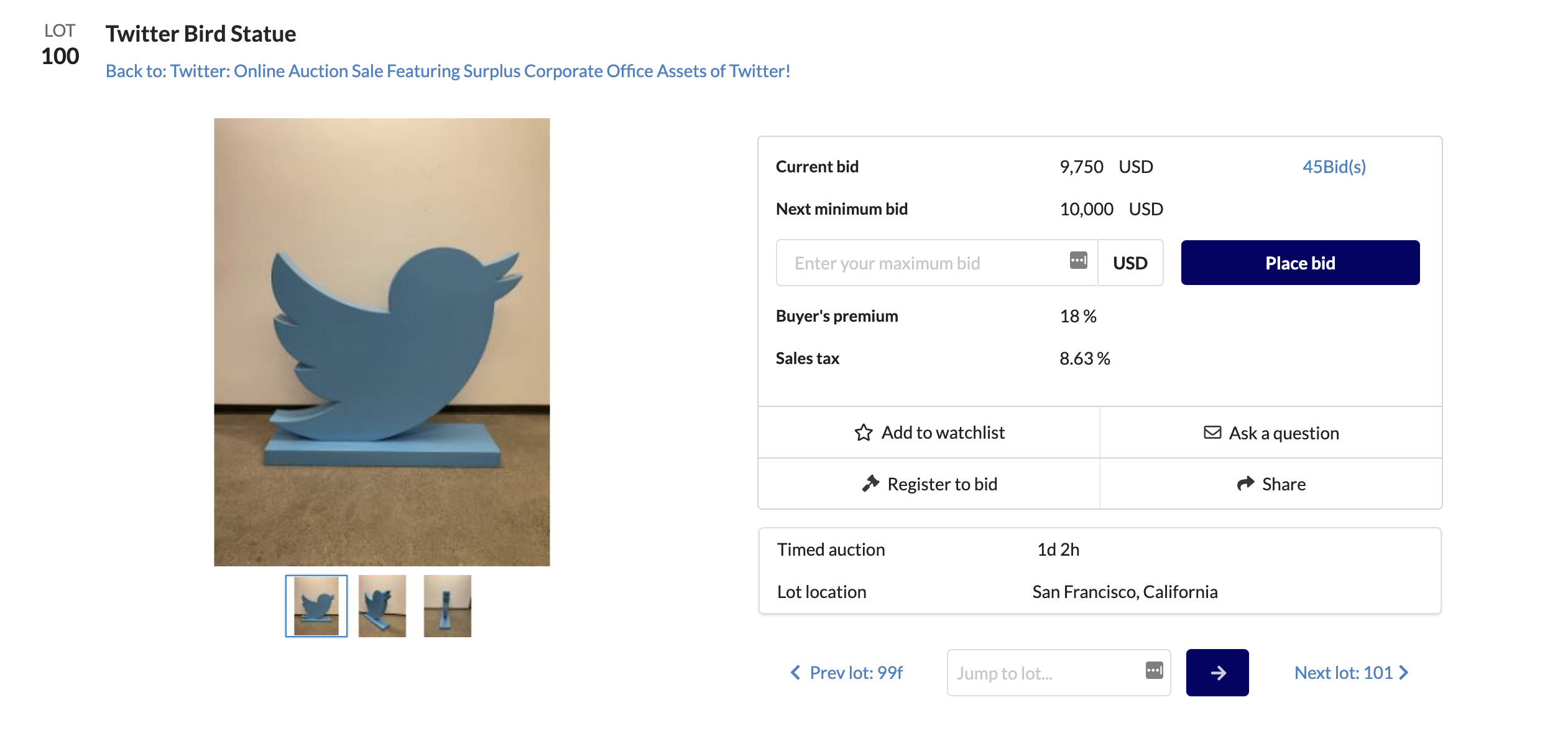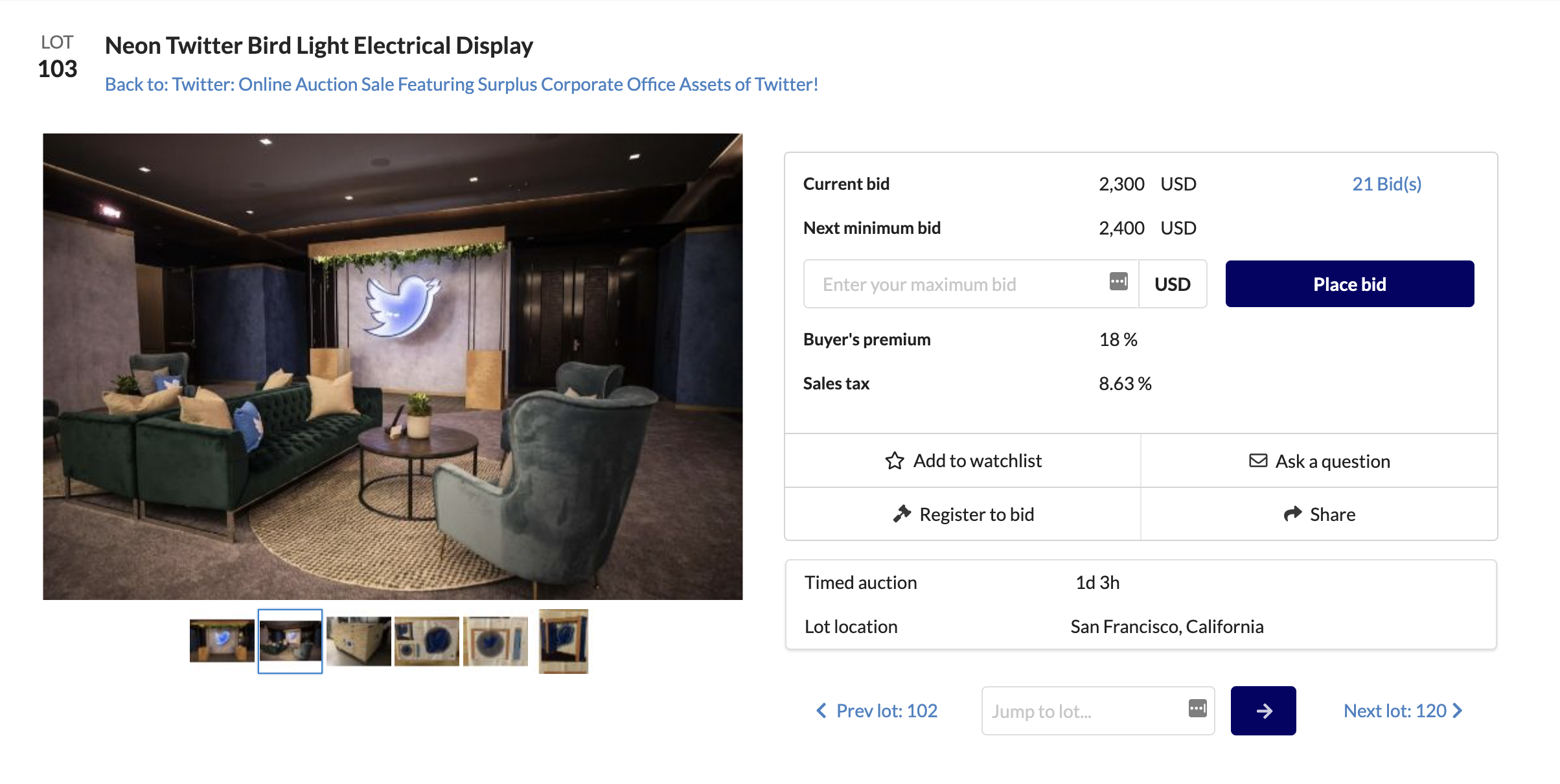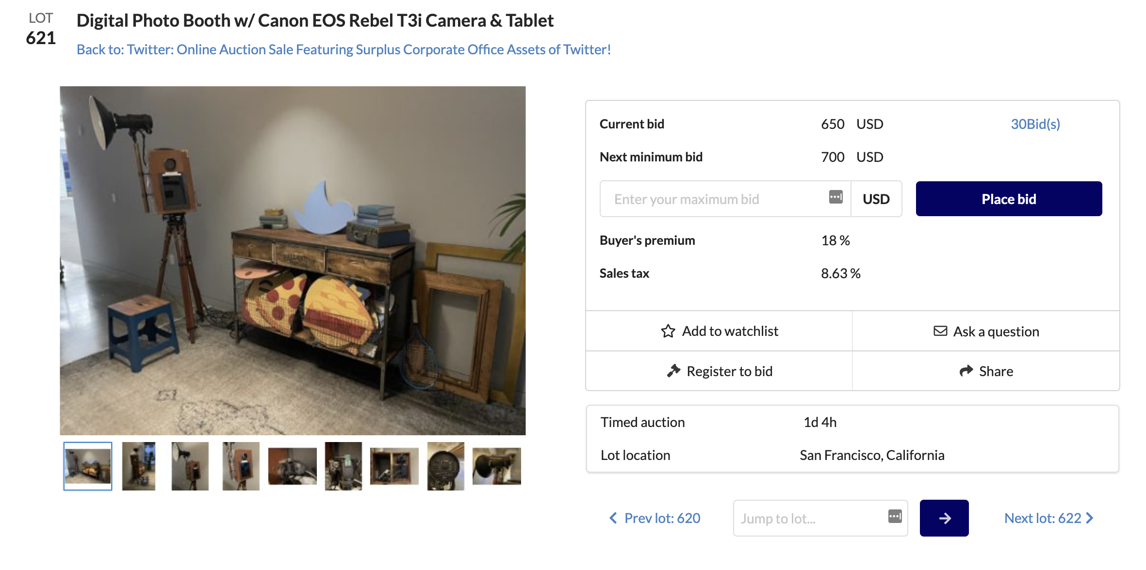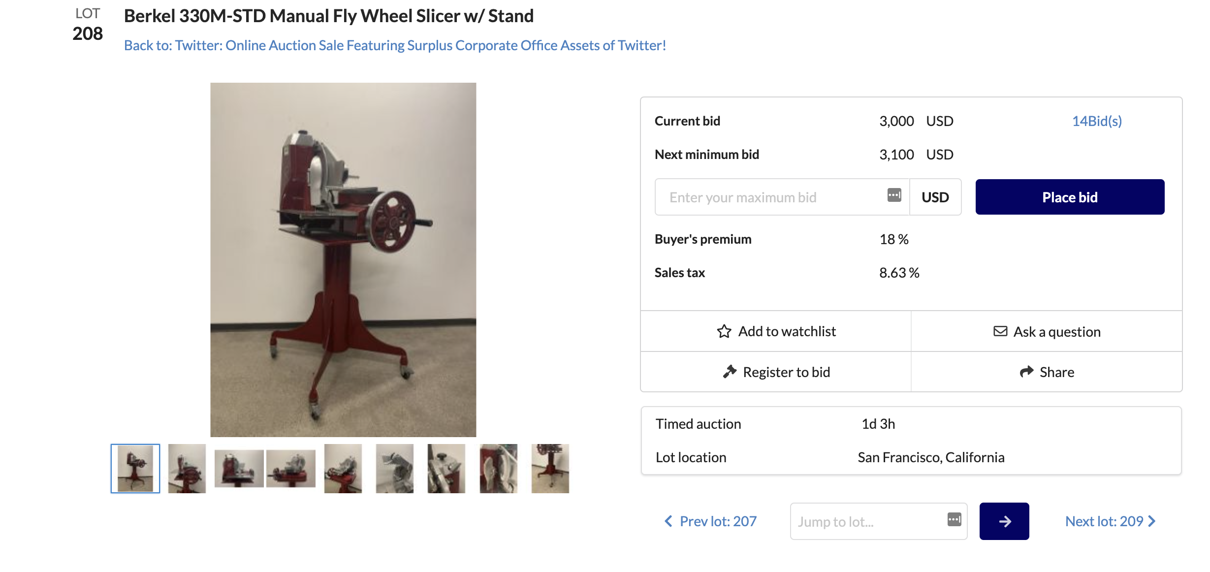 Image Credits: Heritage Global Partners, screenshot by TechCrunch (opens in a new window)I’ve heard through the grapevine that in the pre-Musk days of Twitter, the food was pretty good. If you’re being fed cheese that’s carefully sliced on a $3,000 blade, I can understand why. Bidding on this item started at just $25, then climbed up to $3,000 within an hour. To my surprise, that’s actually a very good deal! The same item — which is marketed here as a prosciutto slicer, rather than a cheese slicer — costs $16,525 from a restaurant supply website. Were they running a Michelin star Italian eatery on the sixth floor of Twitter? Imagine getting laid off from a company that owns $16,525 cheese/proscuitto slicers. I hate to say it, but I kind of understand some of Elon’s woes here.