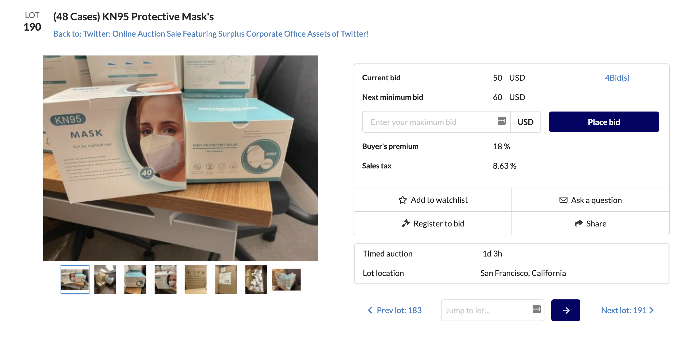 How many blue checks is this worth?: According to a quick Amazon search, you can buy a 40-pack of KN95 masks for about $30. In this auction lot, Twitter is selling 48 cases, which appear to contain 40 masks each. Based on my very serious Amazon analysis, one KN95 mask costs approximately 75 cents. This lot contains 1,920 masks. So, if this sells at market rate, this should cost $1,440, or 180 blue checks.