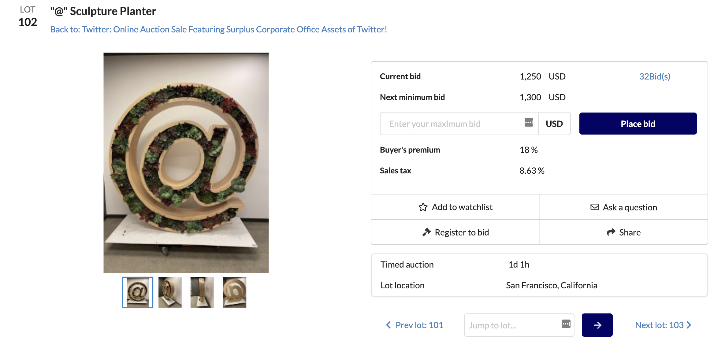 Here’s my opinion, take it or leave it. This is the coolest item up for auction at Twitter HQ. To start, I love plants, and as the listing kindly informs us: “Currently Artificial Plants but can be placed with real plants.” This also sparks joy because it’s not explicitly Twitter memorabilia — after all, Twitter is not the only social network that uses @ handles. This is simply just a beautiful sculpture for the biggest internet nerd in your life.