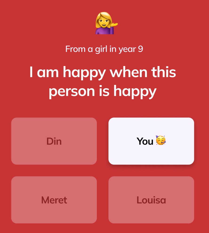 So what’s the attraction here? When users open the app it shows users 12 questions, which the user can only answer by choosing another user (from their school, class or peer group) to pay an anonymous compliment to (or “slay”). For example, the app may ask a user “Who inspires me to do my best?”. They can then choose from four other users from their school to pay this “slay” to. They can then view compliments from other kids, provided they answer the 12 questions when logging on. The identity of those who sent the compliment remains hidden.
