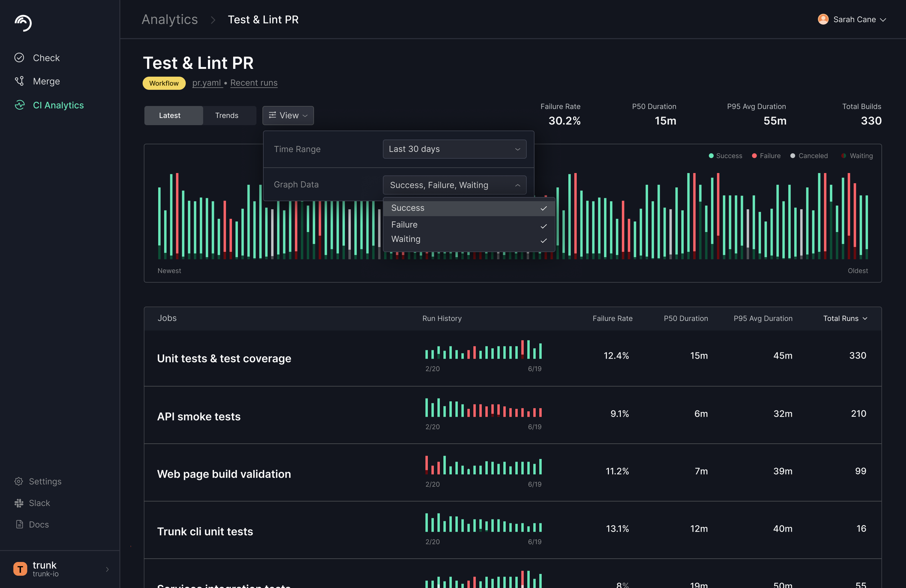 “Without a proper engineering intelligence solution, DevOps and engineering teams are left operating in the dark and engineers are left to guess at what parts of their build and test workflows are slowing down engineering,” said Schleifer. “Trunk CI Analytics eliminates the guesswork with beautiful trend lines, anomaly alerting and the ability to perform deep historical analysis within a few clicks. Operating without this level of engineering intelligence can be the difference between shipping code on time and slowly grinding to a halt.”