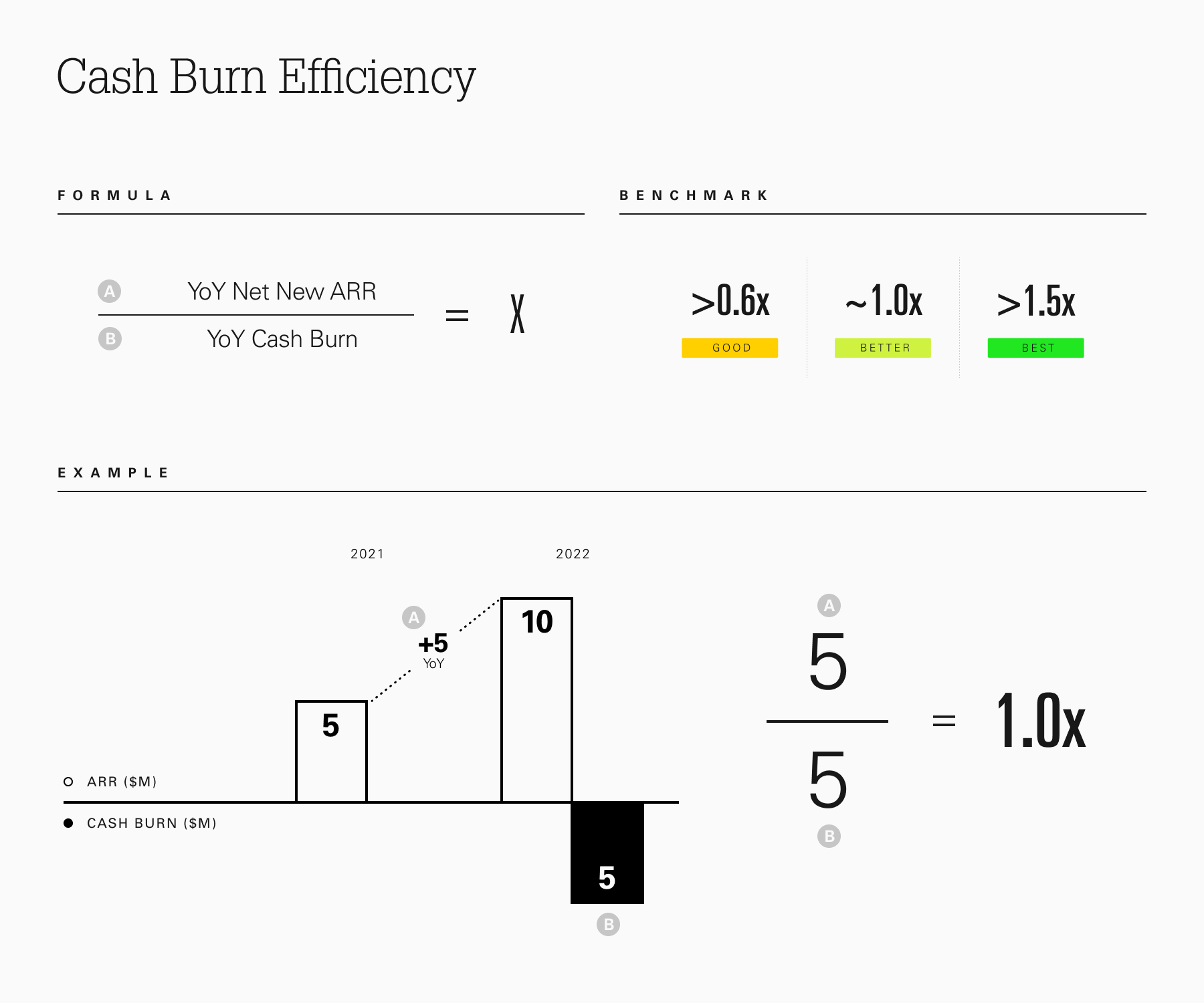 In general, if you are earning net new ARR of $1 for each dollar spent, you are in a strong position — your net new ARR to burn ratio is 1, which is healthy relative to benchmarks. A ratio greater than 1.5x is best-in-class, and if it’s below 0.6x, a closer look may be warranted.