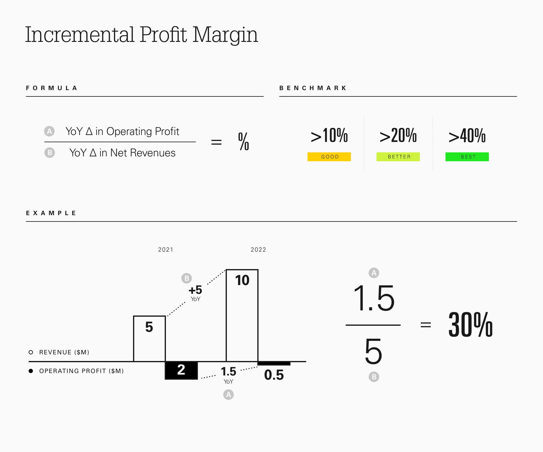 One way to analyze whether progress toward profitability looks healthy is to analyze incremental profit margin from one period to the next. This metric is great for understanding how much of revenue is converting to operating profit.