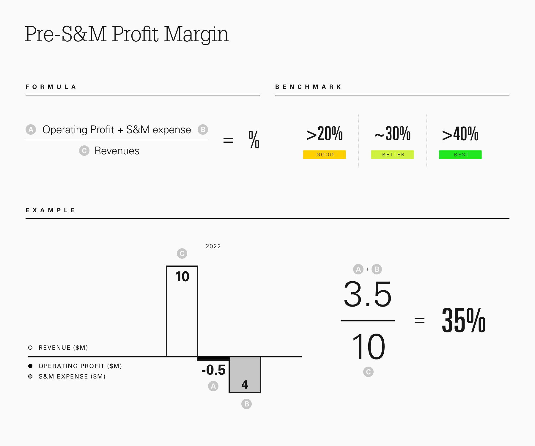 Given that S&M is considered an investment, one helpful metric to analyze cost structure is pre-S&M profit, which takes operating profit margin and adds back sales and marketing expenses. This tells you how much margin you have before investing in S&M. A pre-S&M profit margin of approximately 20% or more can be considered quite healthy because it means your company has enough of a budget to invest in S&M. Anything above 40% would be considered best-in-class.
