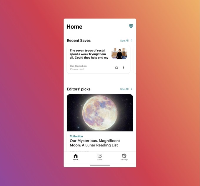 With the update, Pocket will now gain a new Home tab that combines access to recently saved items alongside editorial recommendations. At the top of the screen, readers will be able to view their most recent saved item and click a button to “see all,” if they want to browse through their to-read list. However, the Home tab will feature a collection of Editor’s Picks, as well, in addition to recommendations from specific categories, like technology, travel or science, for example.