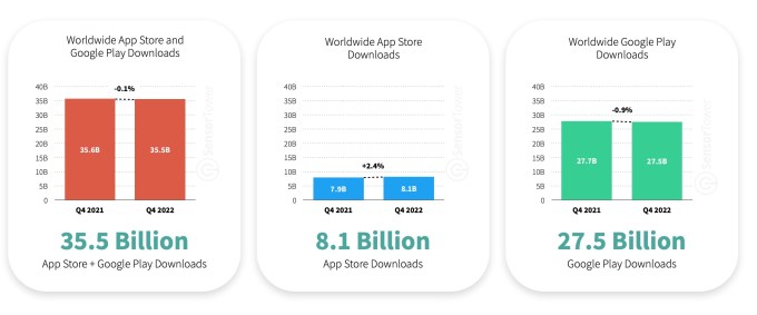 According to app intelligence firm Sensor Tower, mobile app adoption across the App Store and Google Play Store leveled off in Q4 2022, declining a slight 0.1% year-over-year to reach 35.5 billion new installs in the quarter.