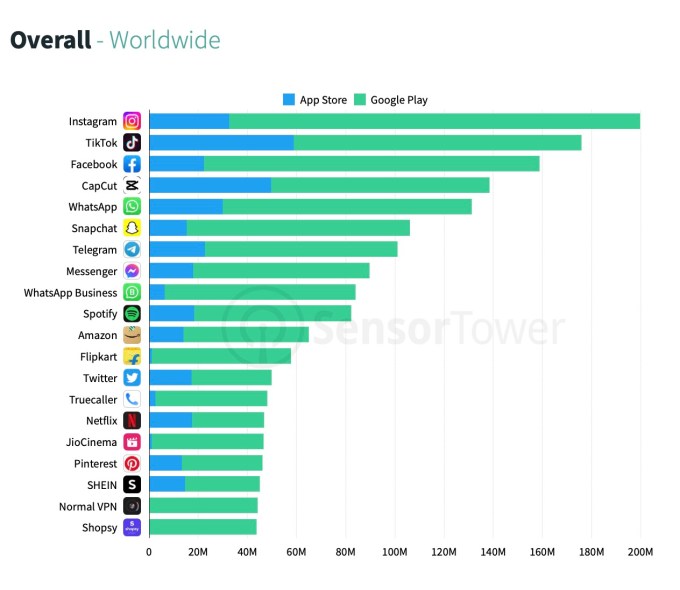 Worldwide, Instagram edged out TikTok for the No. 1 spot, and Meta’s other apps found a place in the top 10 (Facebook at No. 3, WhatsApp at No. 5, Messenger at No. 8, and WhatsApp Business at No. 9.) ByteDance’s CapCut, an extension of TikTok’s workflow, is No. 4. Other top apps include the usual suspects, like Snapchat, Telegram, Spotify, Amazon, Flipkart, Twitter, and more big names.