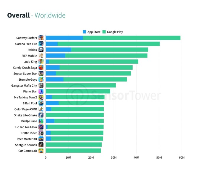 On the App Store, game downloads declined 6.9%, on Google Play, they gained a small 0.6%.