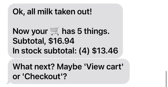 Still, I tapped “Send” to remove the old items (which were not the newly-added milk), only to be returned to the main chat screen where I was informed, inaccurately, “Ok, all milk taken out!” Now my cart had 5 things, it said. It had only removed one of my selections.