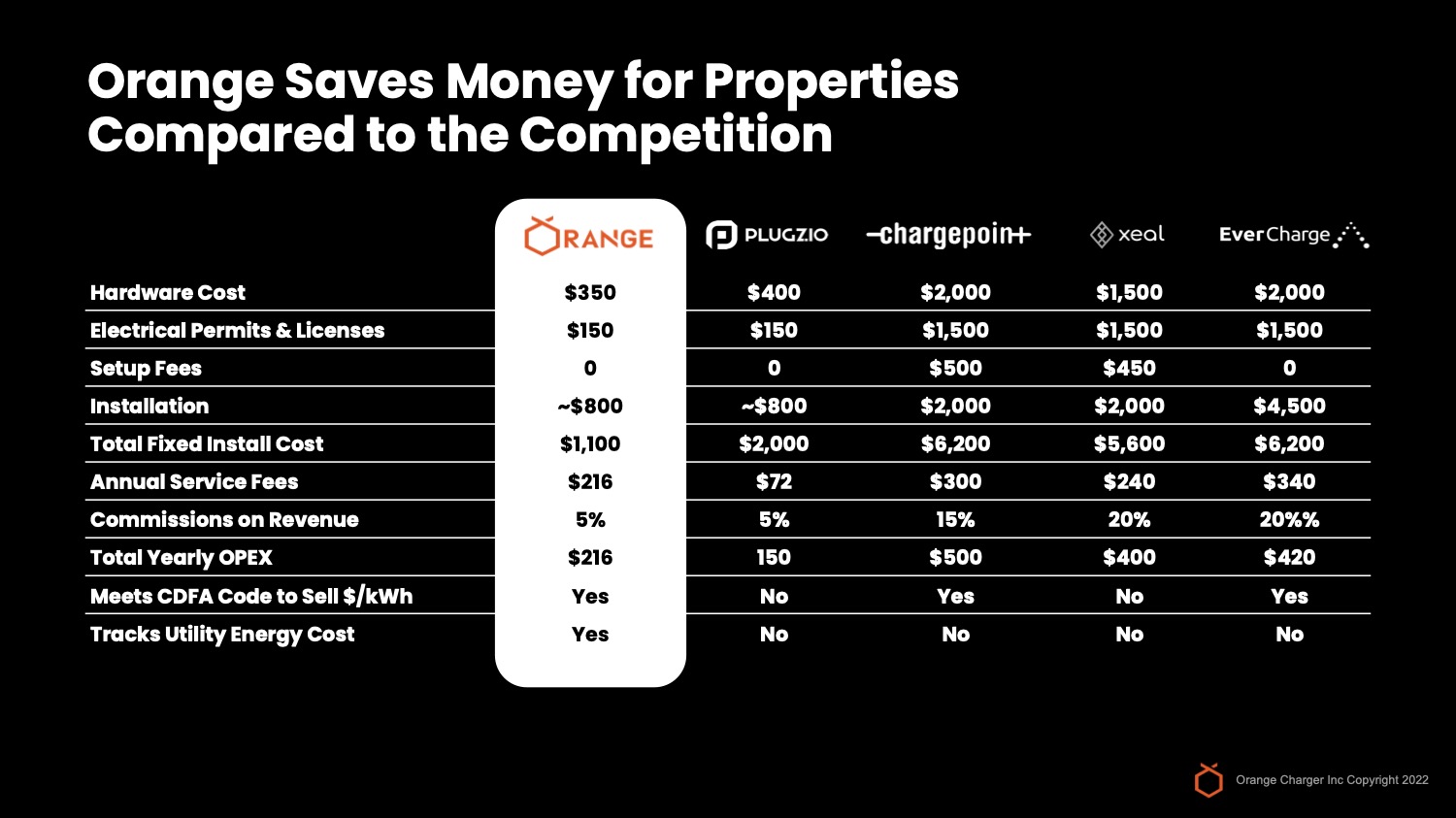 I’m not 100% sure exactly how this comparison table works: The “total fixed install cost,” for example, doesn’t add up with the line items above, so I’m unsure what that refers to. It would also have been helpful to define CDFA, along with what the main difference is between Orange and Plugzio — on paper, at least, they look pretty similar, and if being CDFA code compliant and/or tracking utility costs is important enough, I’d hazard that Plugzio is already on the case of developing or rolling it out.