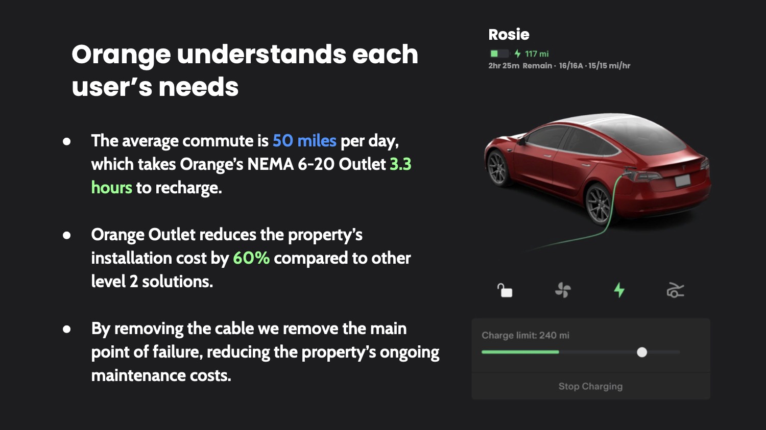 For a perfect score here, I would have made this slide about the company. Make the text orange and change it to something like “We simplify installing, scaling and managing ⚡️ electric vehicle charging in multiunit properties.” That way, it isn’t about the problem — it’s about the company and the solution. A small box showing the company’s progress and the purpose of this fundraise (“500 chargers installed in 75 locations, raising $2.5 million to 10x our install base”) would be even better.