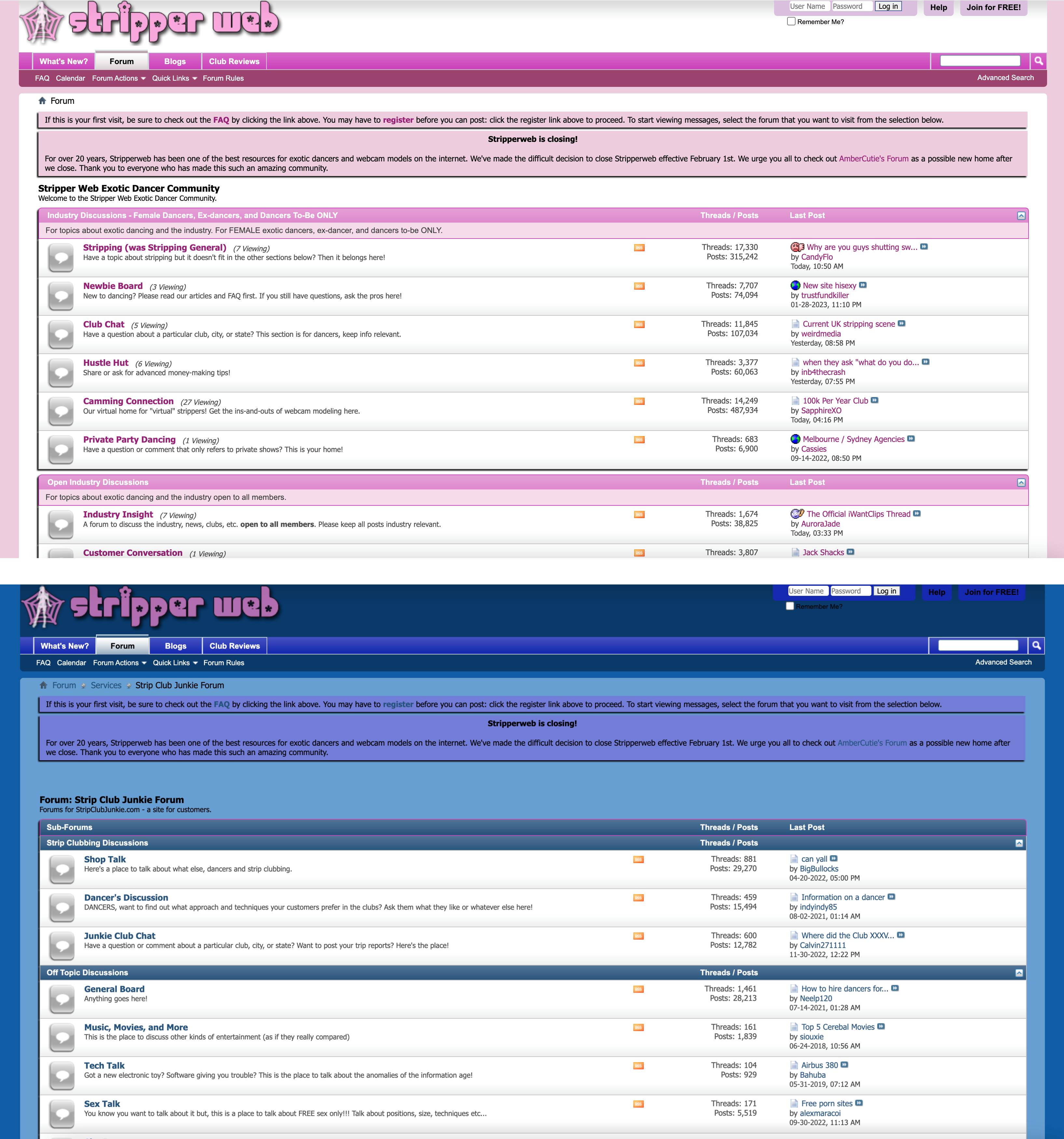 “For over 20 years, Stripperweb has been one of the best resources for exotic dancers and webcam models on the internet. We’ve made the difficult decision to close Stripperweb effective February 1st. We urge you all to check out AmberCutie’s Forum as a possible new home after we close. Thank you to everyone who has made this such an amazing community.”