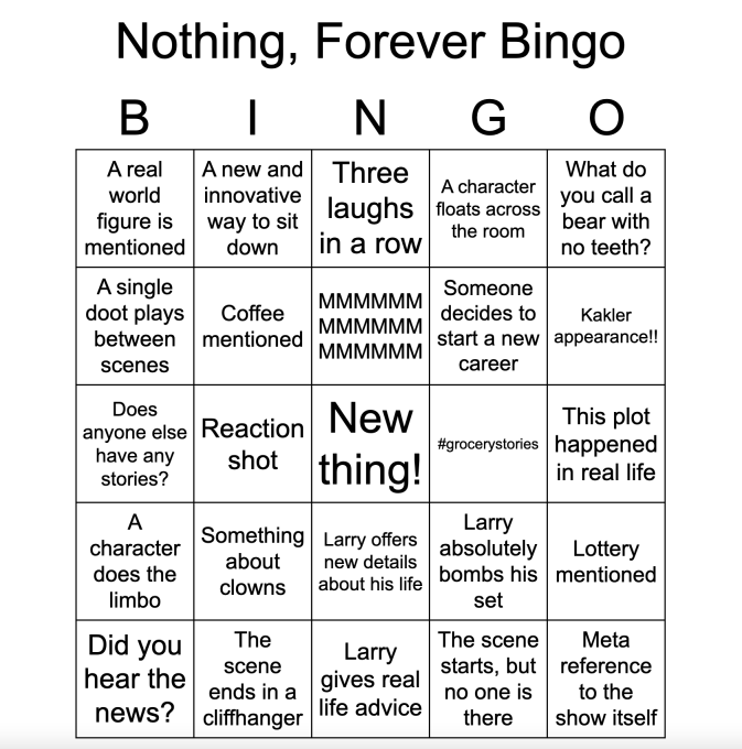In the same vein, “Nothing, Forever” fans try to parse dialogue to learn more about the universe of the show. On Discord, fans requested a new channel to keep track of new lore as it develops; one page on the wiki chronicles what we know from past mentions of aliens. The community also keeps track of Larry’s recurring standup jokes, which are pretty bad (“What do you call a bear with no teeth? A gummy bear.”), but somehow get funnier the more they’re repeated.