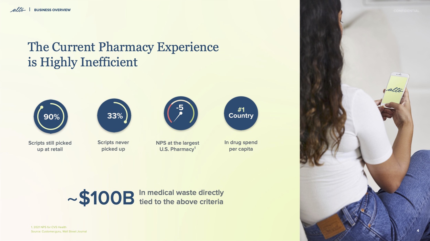 Alto Pharmacy leans into inefficiency and waste as the biggest problems in its market, with 90% of scripts being picked up in retail pharmacies, 33% of scripts never getting collected and a -5 NPS score for the largest pharmacy meaning that, well, there’s a lot of room for disruption there.