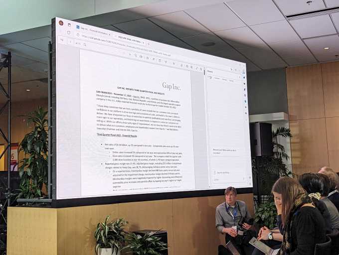 Mehdi showed off how Edge’s AI powers could be put to use in a handful of demos during the event. In one, he visited the Gap website to look up the quarterly reports and earnings. He clicks a link to view the Q3 report and it pulls up a 15-page PDF.