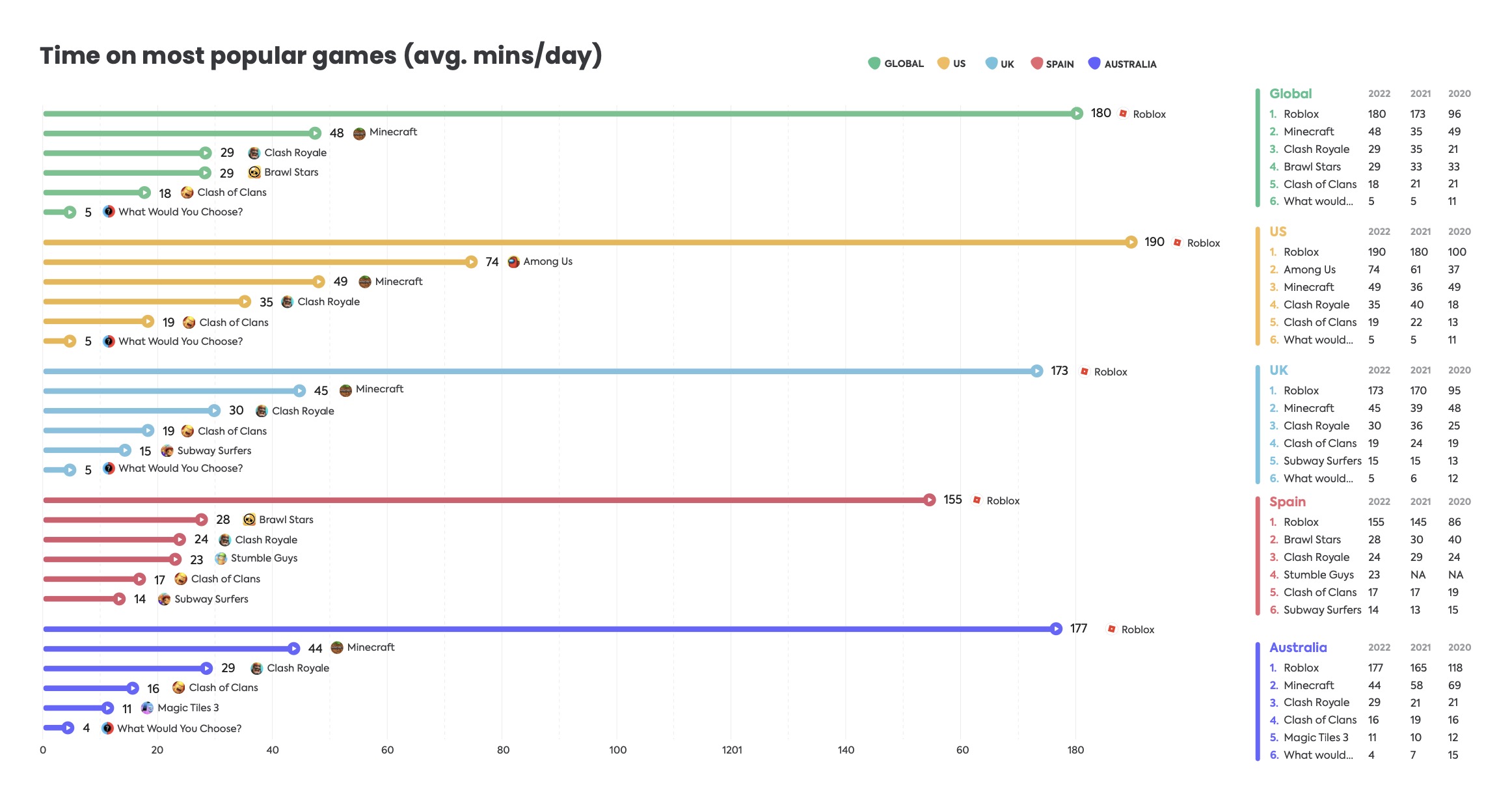 Though the software firm chose to analyze Roblox among other video games, it’s worth also noting the game is a social network of sorts — and an extremely popular destination among kids worldwide. The gaming platform was popular with 59% of kids globally, and average daily time spent grew 4% year-over-year to 180 minutes. That’s larger than any other games, including the No. 2 game, Minecraft (up 37% to 48 mins.), Clash Royale, Brawl Stars, Clash of Clans and What Would You Choose?