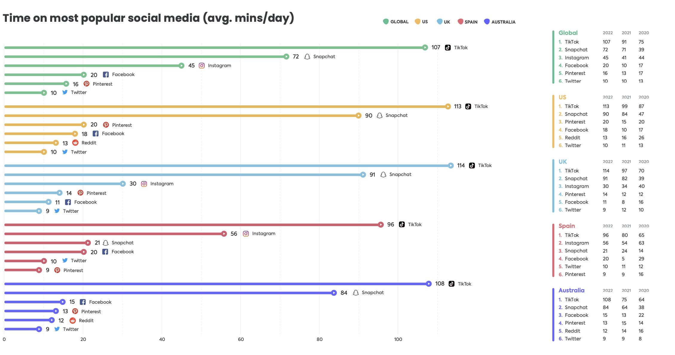 This past year, the gulf between the two widened, it said, as kids in 2022 saw their average daily use of TikTok climb to a whopping 107 minutes, or 60% longer than the time they spent watching video content on YouTube (67 minutes).