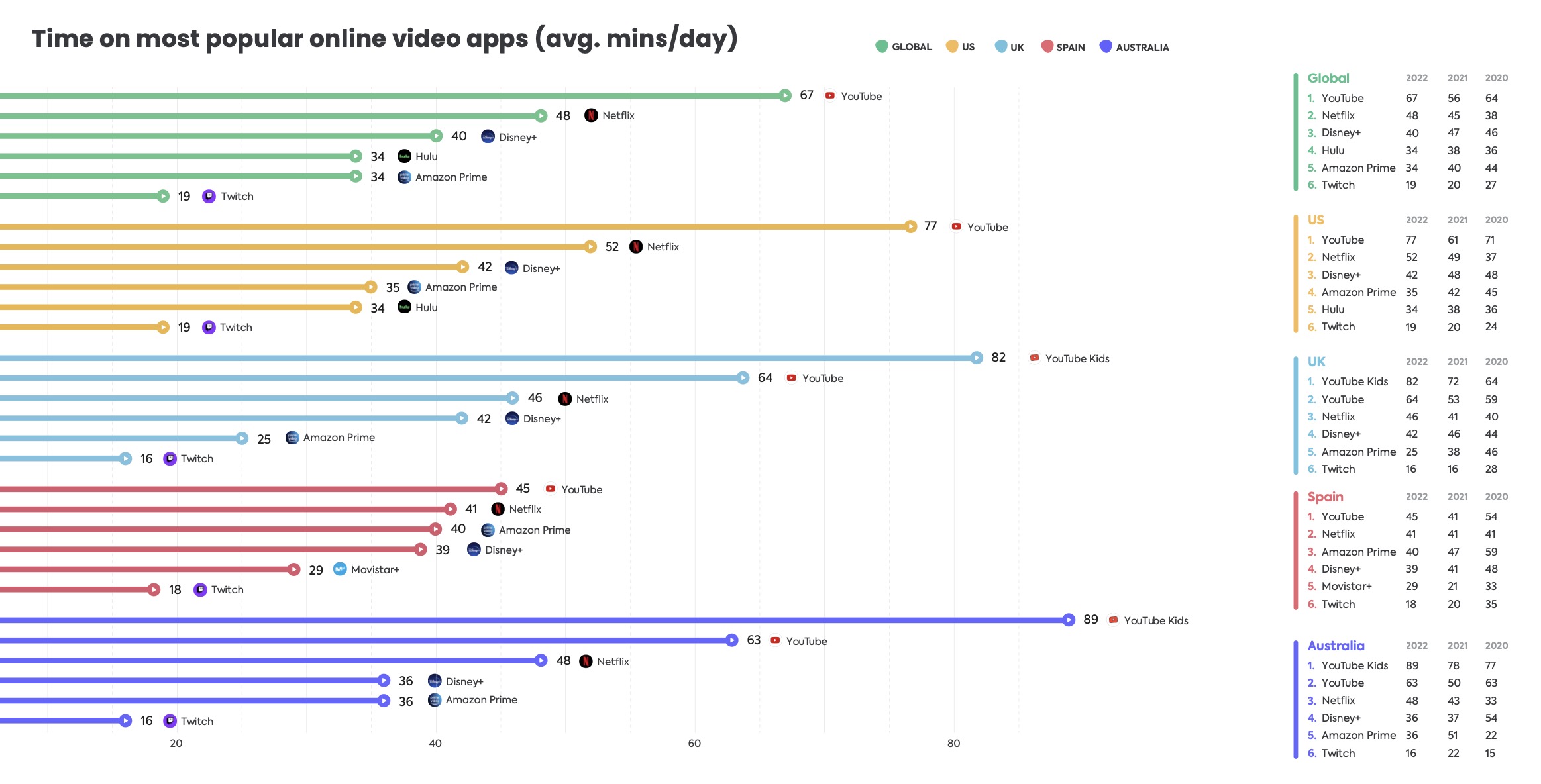 Overall, kids under 18 managed to increase their video content viewing by 18% in 2022, watching 45 minutes daily, on average, across long-form video services like YouTube, Netflix, Disney+, Prime Videos and others.