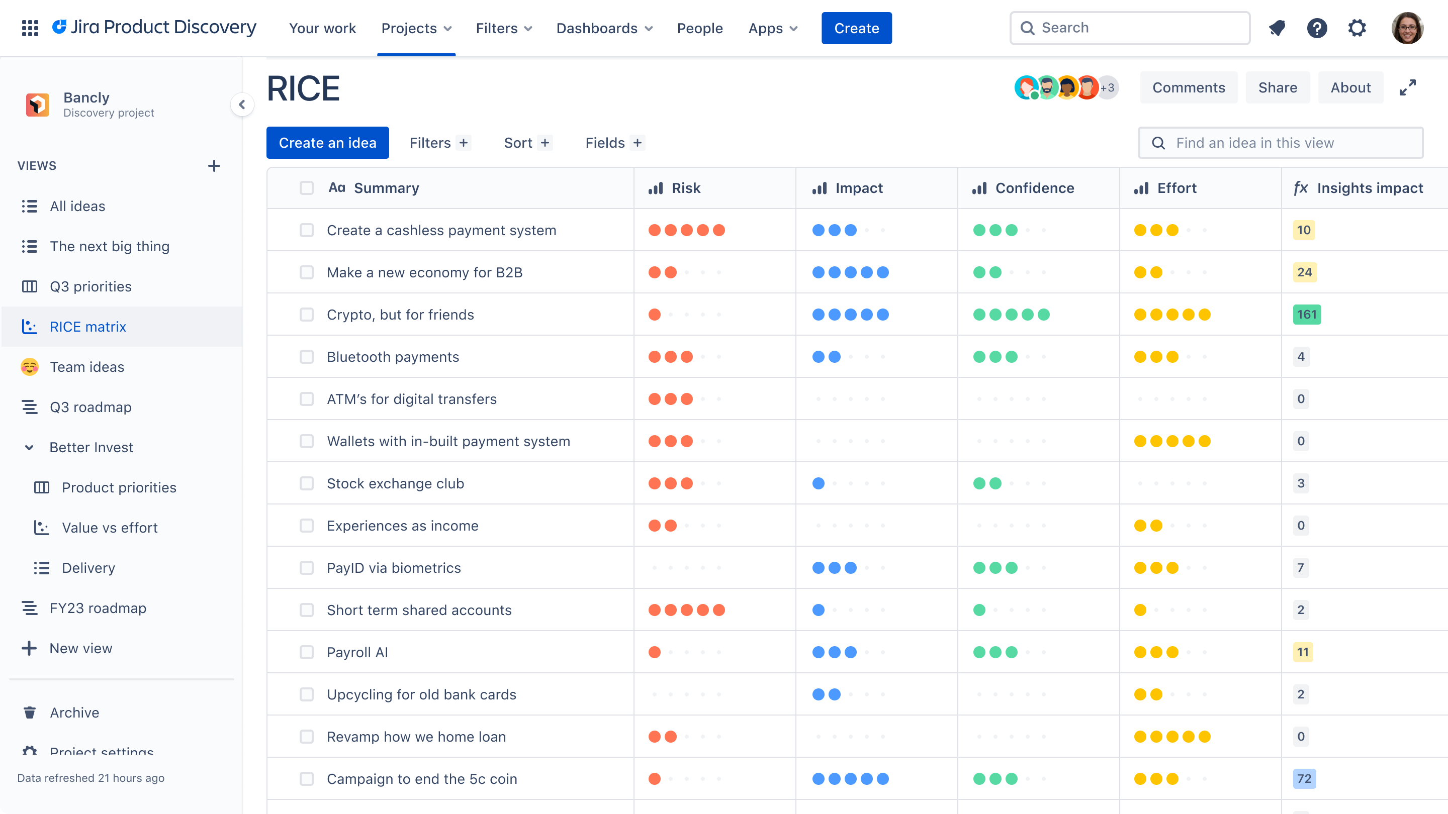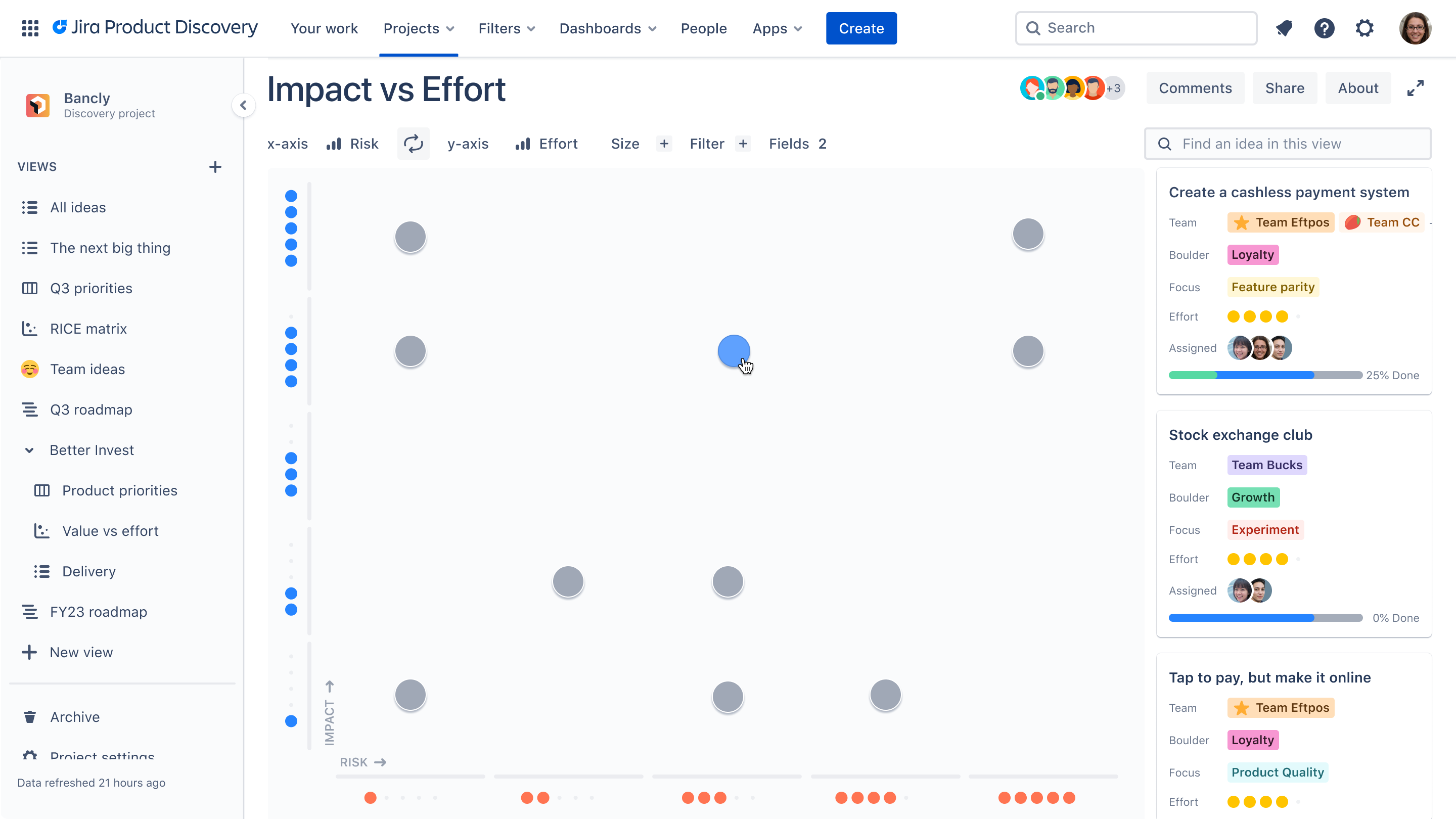 In practice, this means users will get tools to vote for ideas, talk about them and rate them according to their risk, impact, effort and other metrics. Jira Product Discovery also features a number of visualizations that can then help teams better understand the trade-offs between the impact of a given choice and the effort it’ll take to build a given feature, for example.