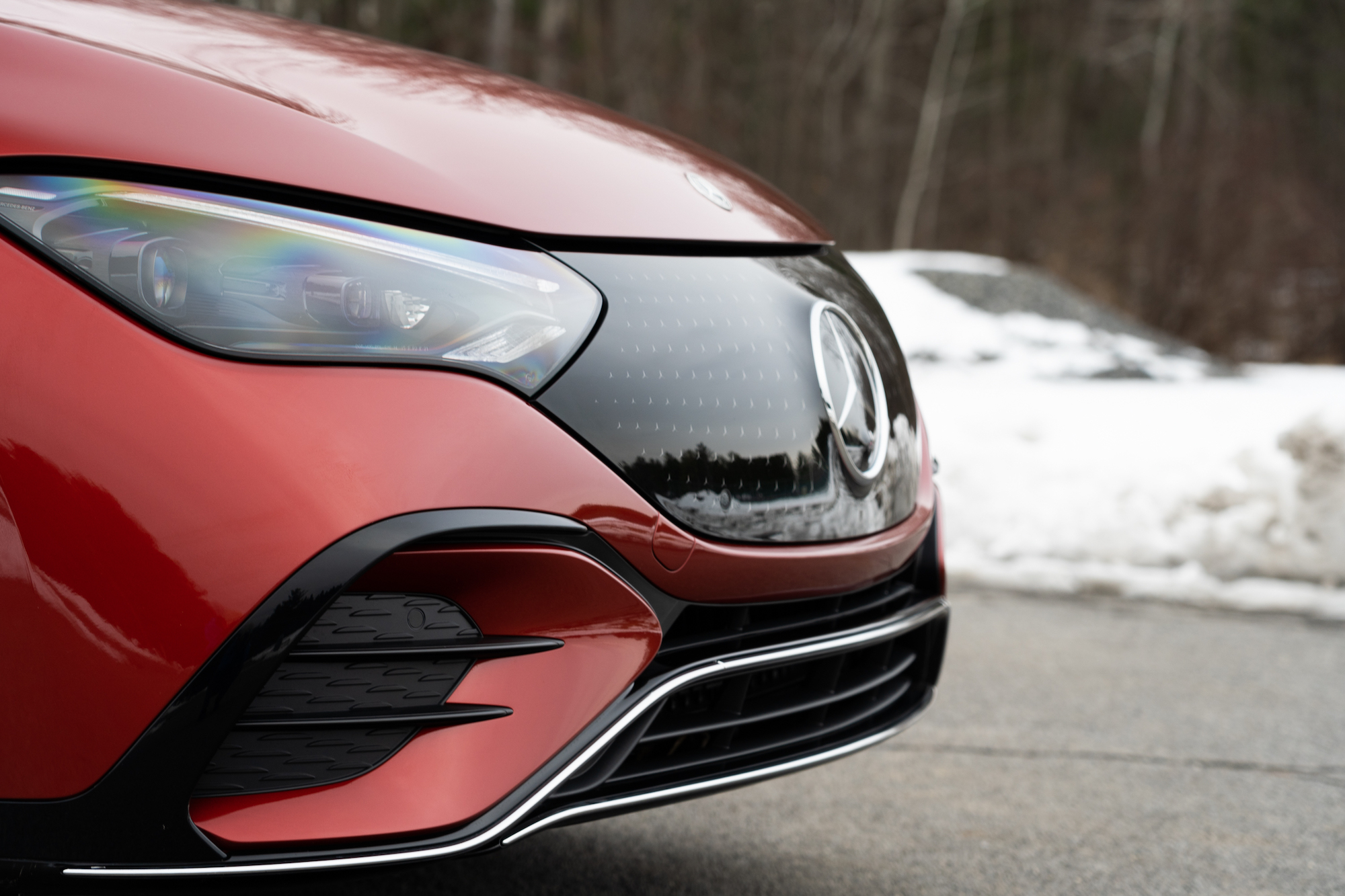 The detailing on the nose looks fresh; the three-pointed star sits bold and centered within a radiating field of stellar echoes, an arrangement far more appealing than the fake grilles found on a lot of other EVs.