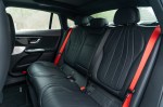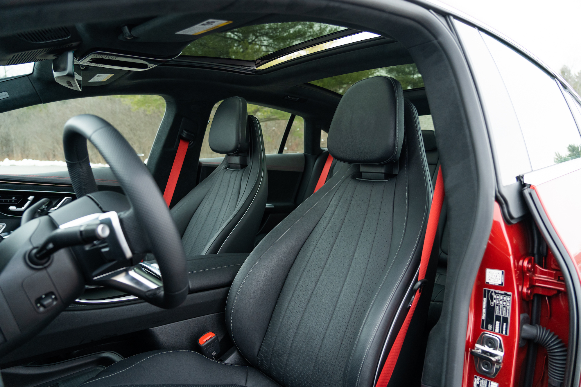 The EQE 500 you see here has the ($2,100) AMG Line interior package, which means sport seats, a racier steering wheel, some extra branding and the contrasting red seat belts.