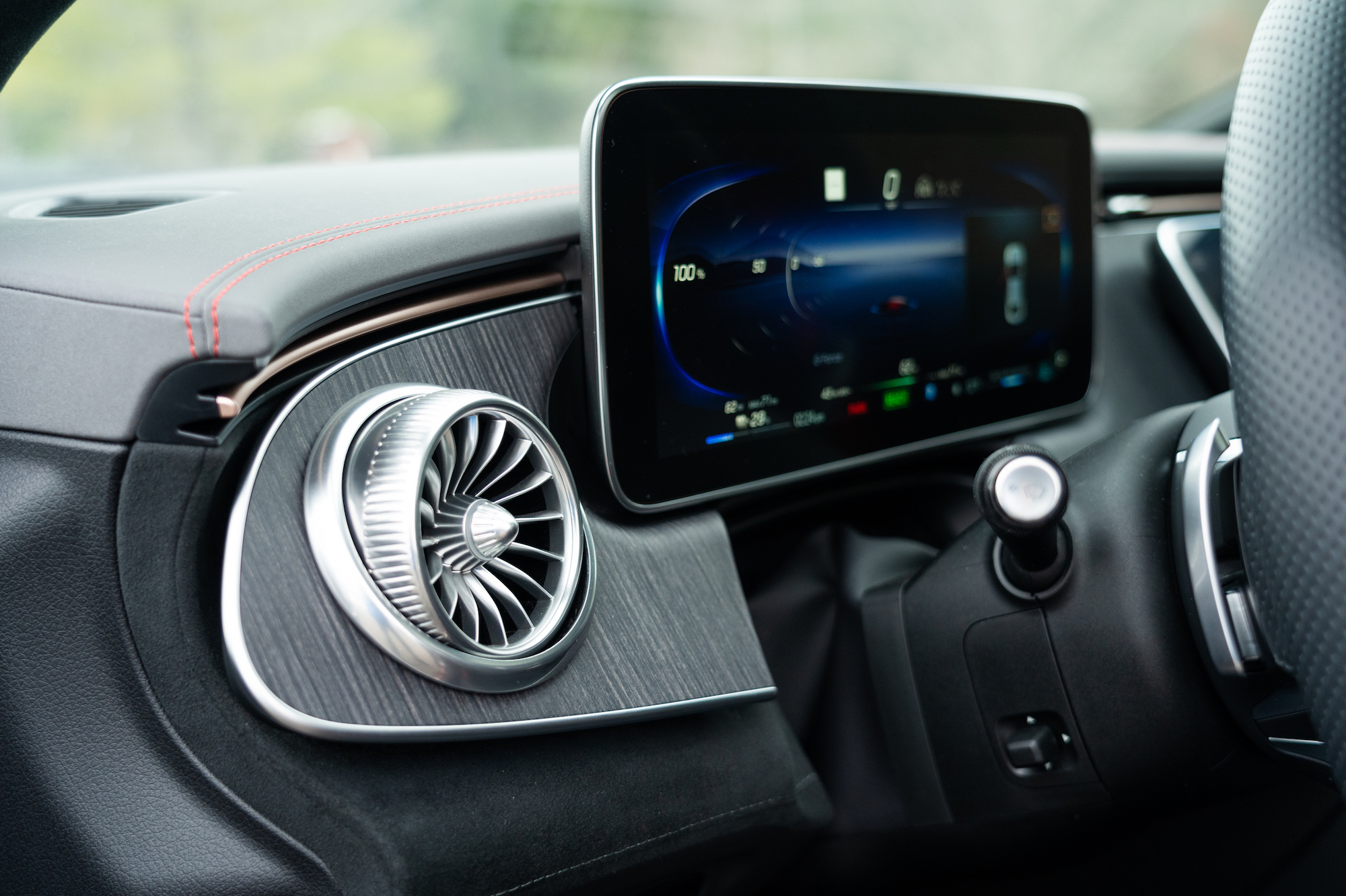 There’s also generous Alcantara and microfiber surfaces throughout, which pair beautifully with the Black Linden wood on the dashboard. That, plus the stunning turbine vents, make for a clean, modern, beautiful dash.