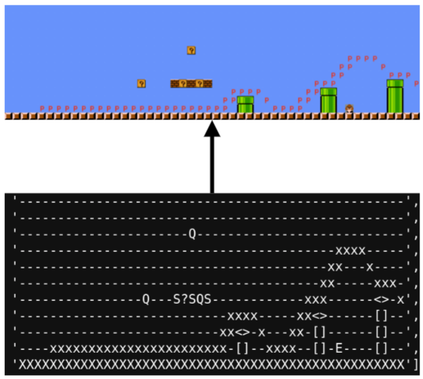 Once the level is represented as a series of ordinary characters, it can be ingested by the model much the way any other series of characters can, be they written language or code. And once it understands the patterns that correlate with features, it can reproduce them.