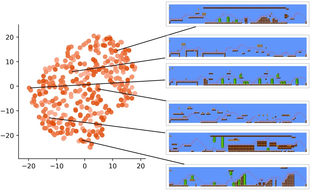Of course that wouldn’t be much of a success if the levels were just flat with occasional pipes to clear. But they included a few functions to measure how simple the path is, and to compare it to levels from the dataset as well. High novelty and “interesting” path trajectories mean doable levels that don’t resemble existing ones, but don’t let the player just walk through.