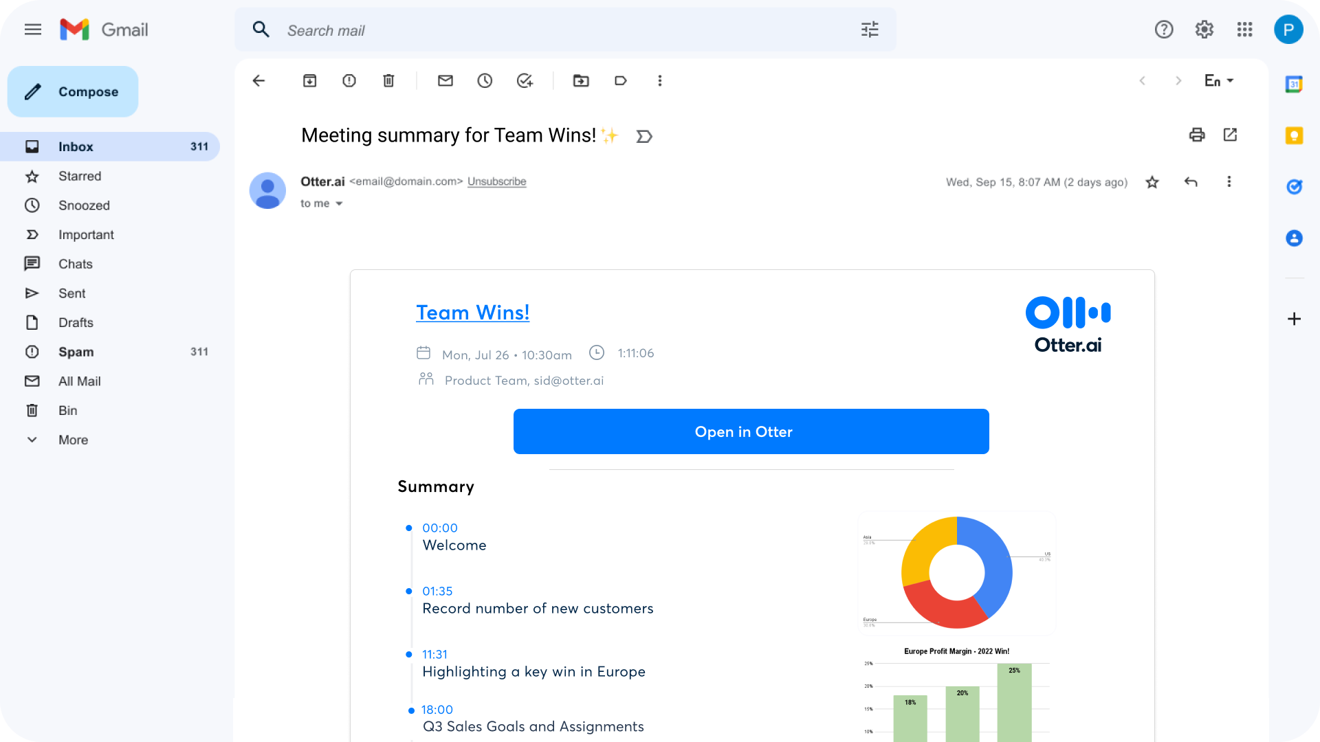 After each meeting, OtterPilot will automatically send an AI-generated summary of key meeting topics to those invited to the meeting or directly to an Otter group. Automated summaries are shared via email, with hyperlinks to key moments. Otter launched an Automated Outline beta feature last year for Business users, but the new Automated Summary feature announced today is the result of an entirely new AI summary model and includes improved summarization. The Automated Summary will be available to all users.