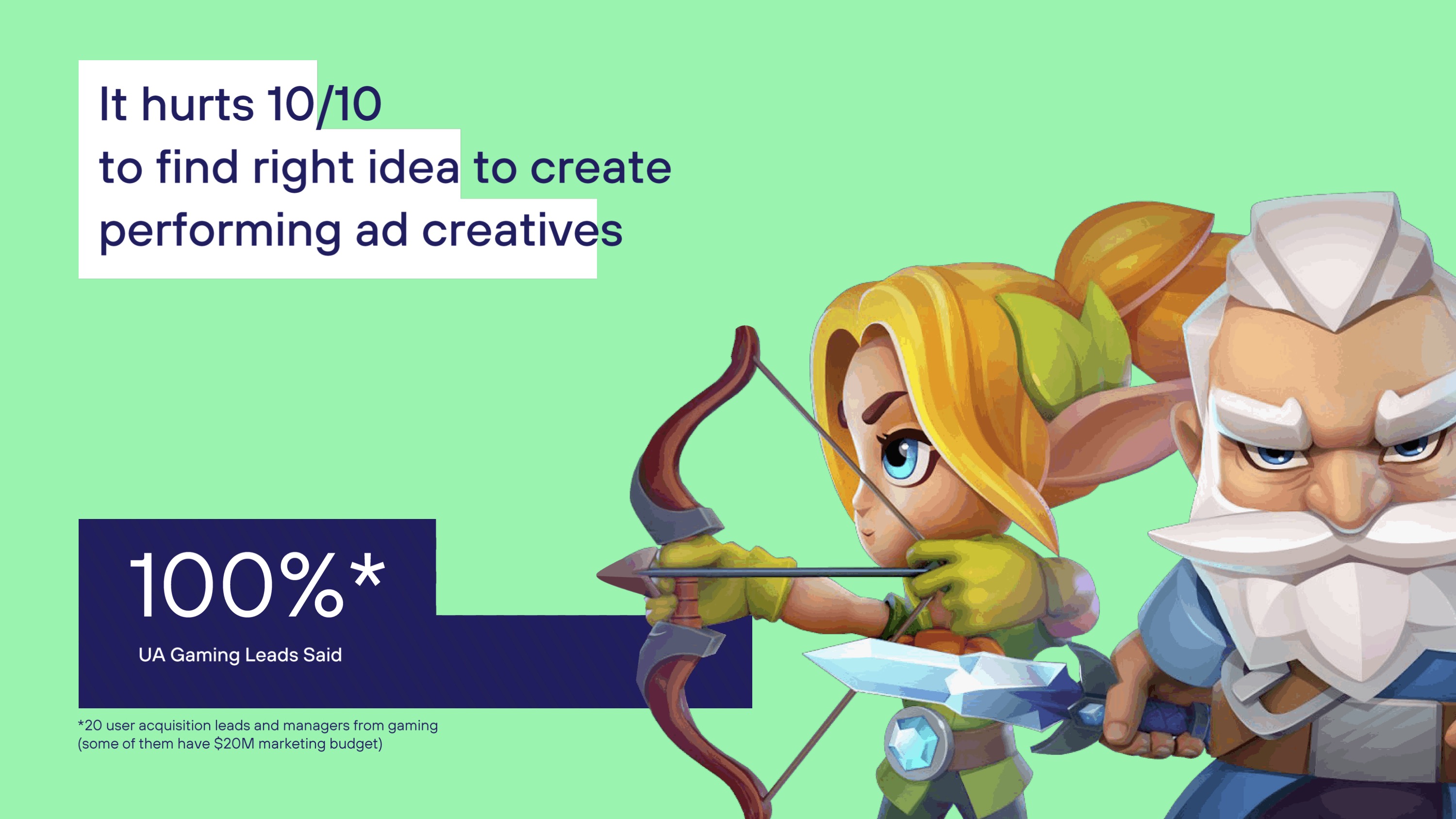 I 100% believe it when the company says that it has found that its target customers (gaming user acquisition marketers) are spending a lot of time iterating on ads that perform well. A sample size of 20 seems a bit low for this slide, so I’d love to have seen some slightly more comprehensive numbers, but that doesn’t reduce the clarity of the problem statement. (Though the grammar leaves a thing or two to be desired.)