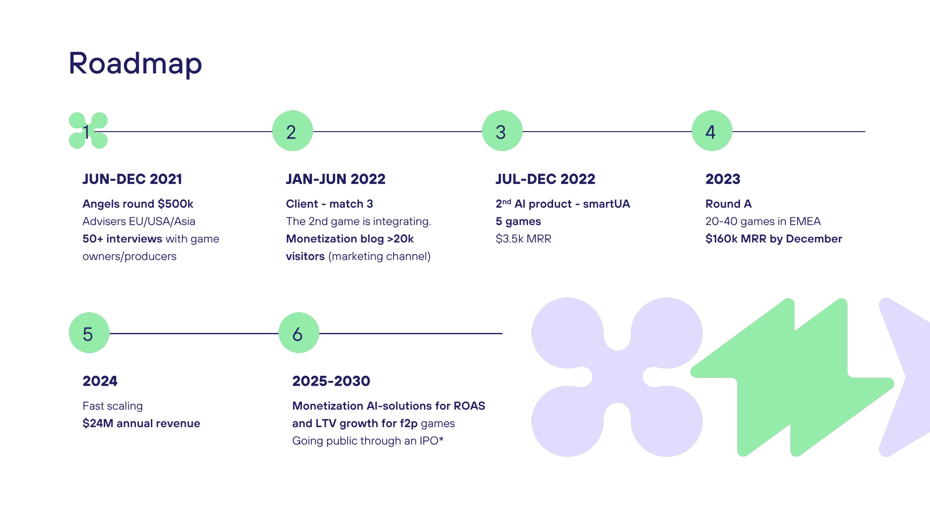 Finally, listing “going public through an IPO” on your slide makes sense in one universe: That should be the goal for every startup in the long run, but a much more likely outcome for an adtech company like this one is that a direct or adjacent market competitor will acquire it as it starts to get the huge amounts of traction it is suggesting it will have by the end of 2024. In short: Ixnay on the exit-ay.