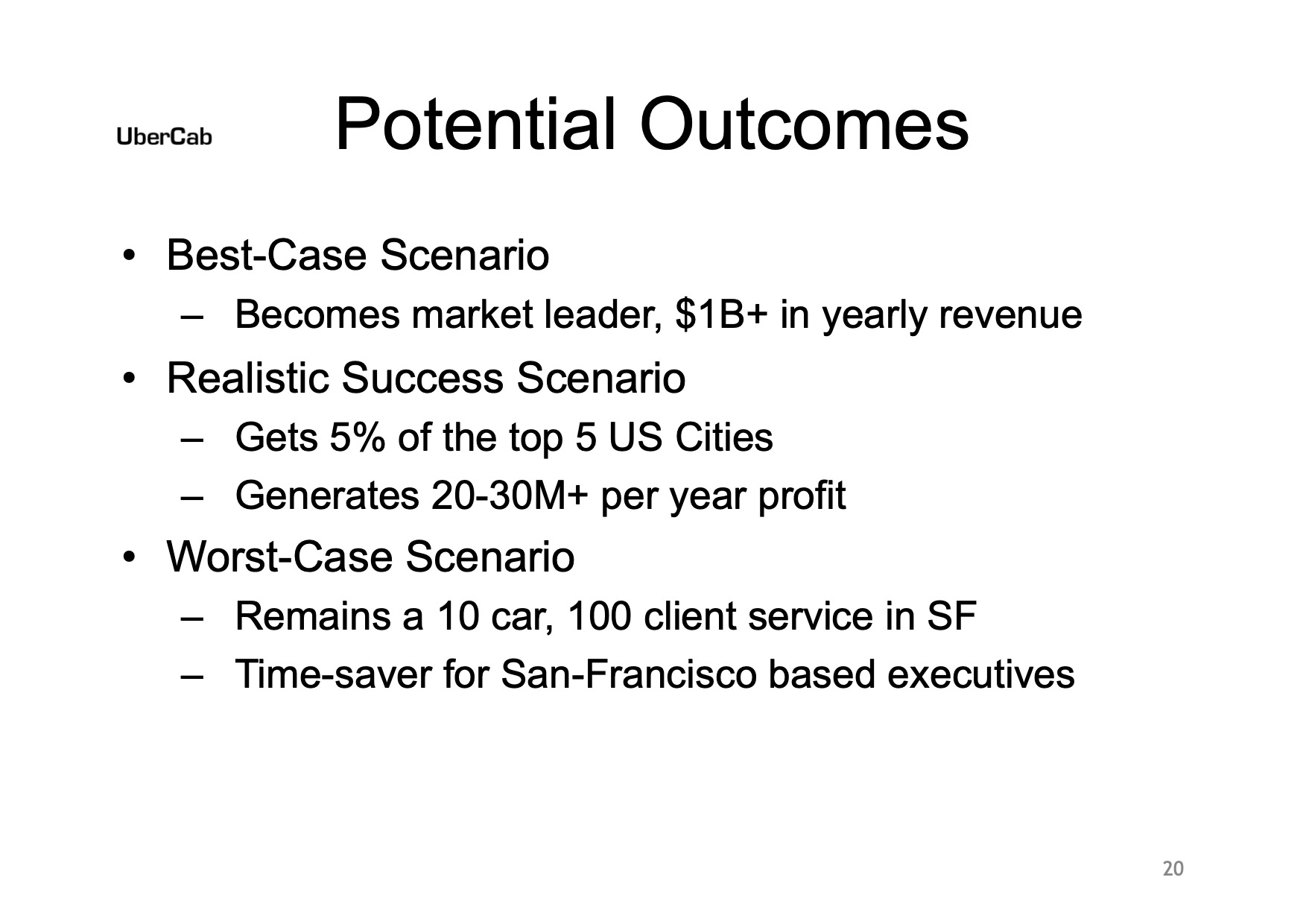 Uber’s founders, in their wildest dreams, imagined that the best-case scenario was $1 billion in annual revenue. To be fair, the $8.6 billion it generated in 2022 is more than $1 billion, so the company was, indeed, right. But it also hoped for a “realistic” scenario of $20 million to $30 million per year of profit. That’s an interesting one — because for ever-so-many years, Uber was running at a significant loss as it was optimizing for aggressive growth over profits. I love this slide so much.