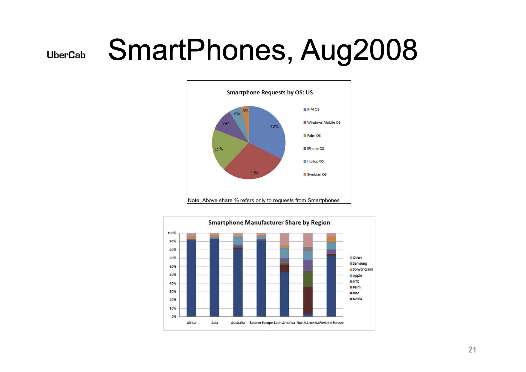 In 2008, smartphones were starting to be a thing. According to Uber’s deck, BlackBerry led the pack with a 32% market share, followed by Windows Mobile (30%), Palm OS (19%), iPhone (10%), Hiptop (6%) and Symbian (3%). It’s pretty wild to consider that out of all of those operating systems, these days, most of those don’t even exist. Apple’s iOS sits at a 60%-ish market share in the U.S., with Android holding the rest. And then there are some also-rans.
