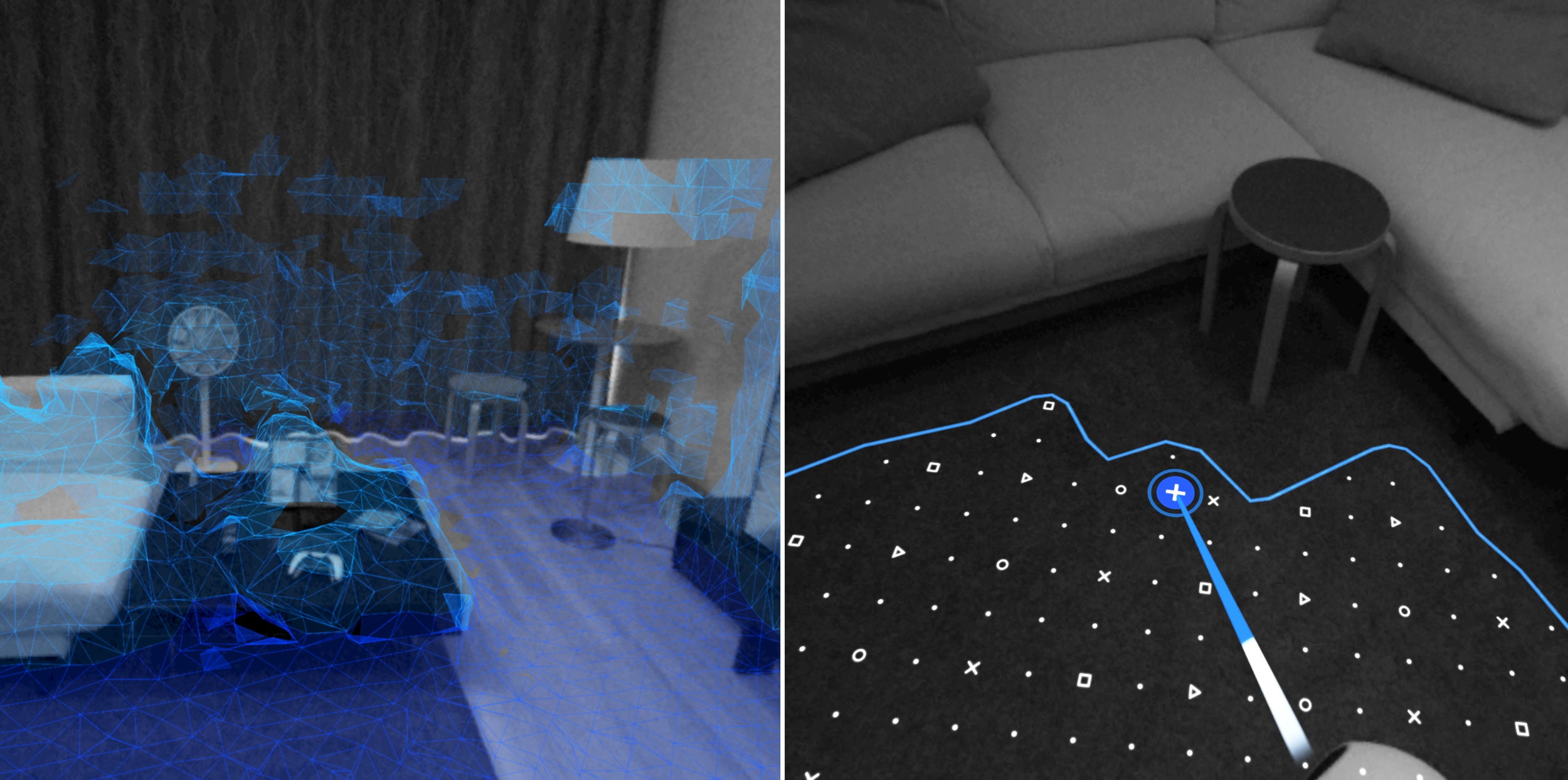 Establishing a play area is done automatically by looking around you in the passthrough mode, which is a black-and-white real-time view of your surroundings (and for some reason slightly unnerving). It builds a little play area using the clear space around you, which you can easily add to or subtract from by zapping it with a beam coming off your controller (it’s quite fun actually).